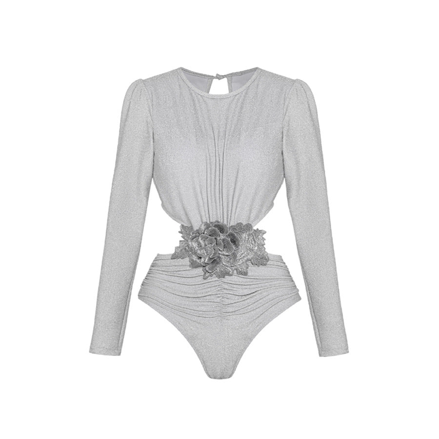 - Details: Halter neckline, deep V plunge, ruched waist, decorative floral belt, tie elements