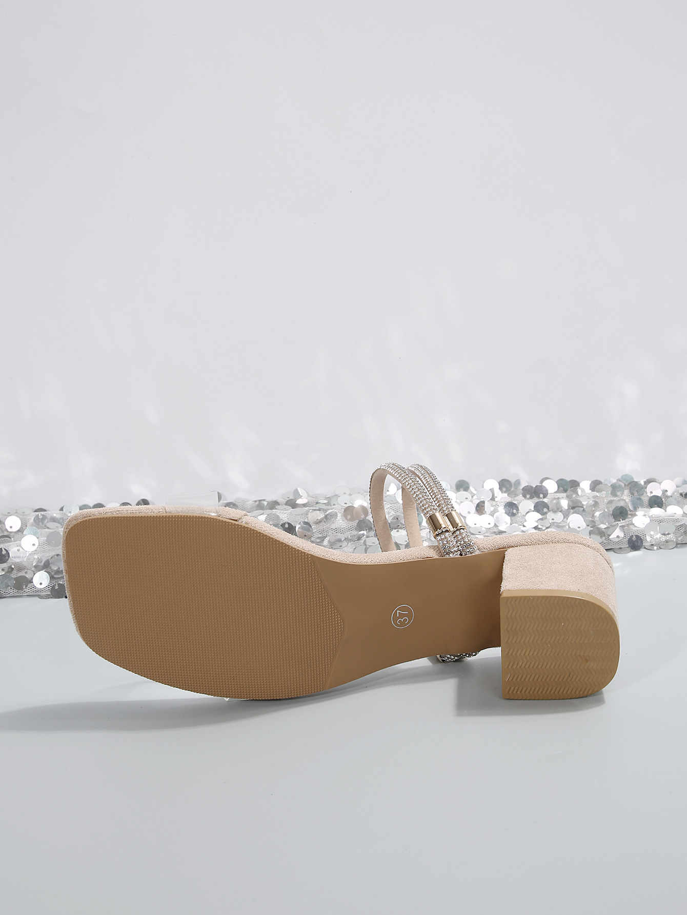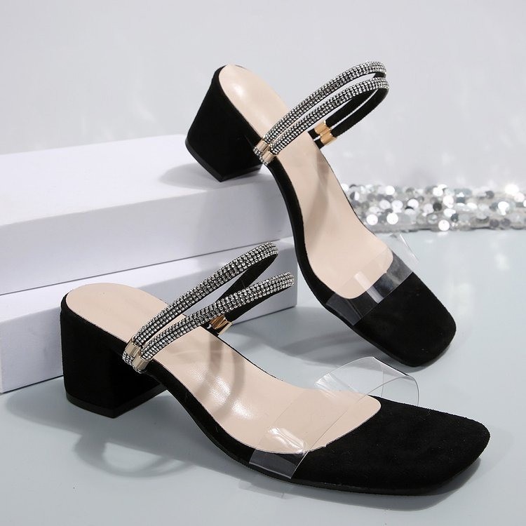 Rhinestone Two Way Chunky Heel Sandals Women Square Toe Chunky Heel Slippers