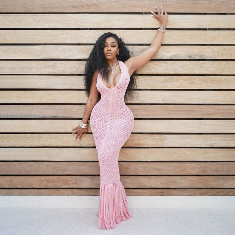 This solid-color knitted maxi dress is designed as a versatile beach cover up and sun protection piece for summer. The garment is crafted from a jersey-knit fabric with polyester composition, offering a smooth, breathable drape with light stretch. The halter neckline leads to a fitted, sleeveless bodice that flows into a sleek maxi skirt, finished with a fringe hem for texture and movement.