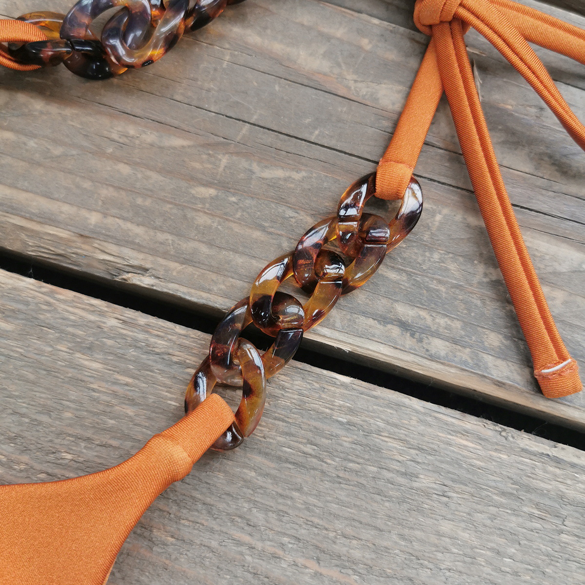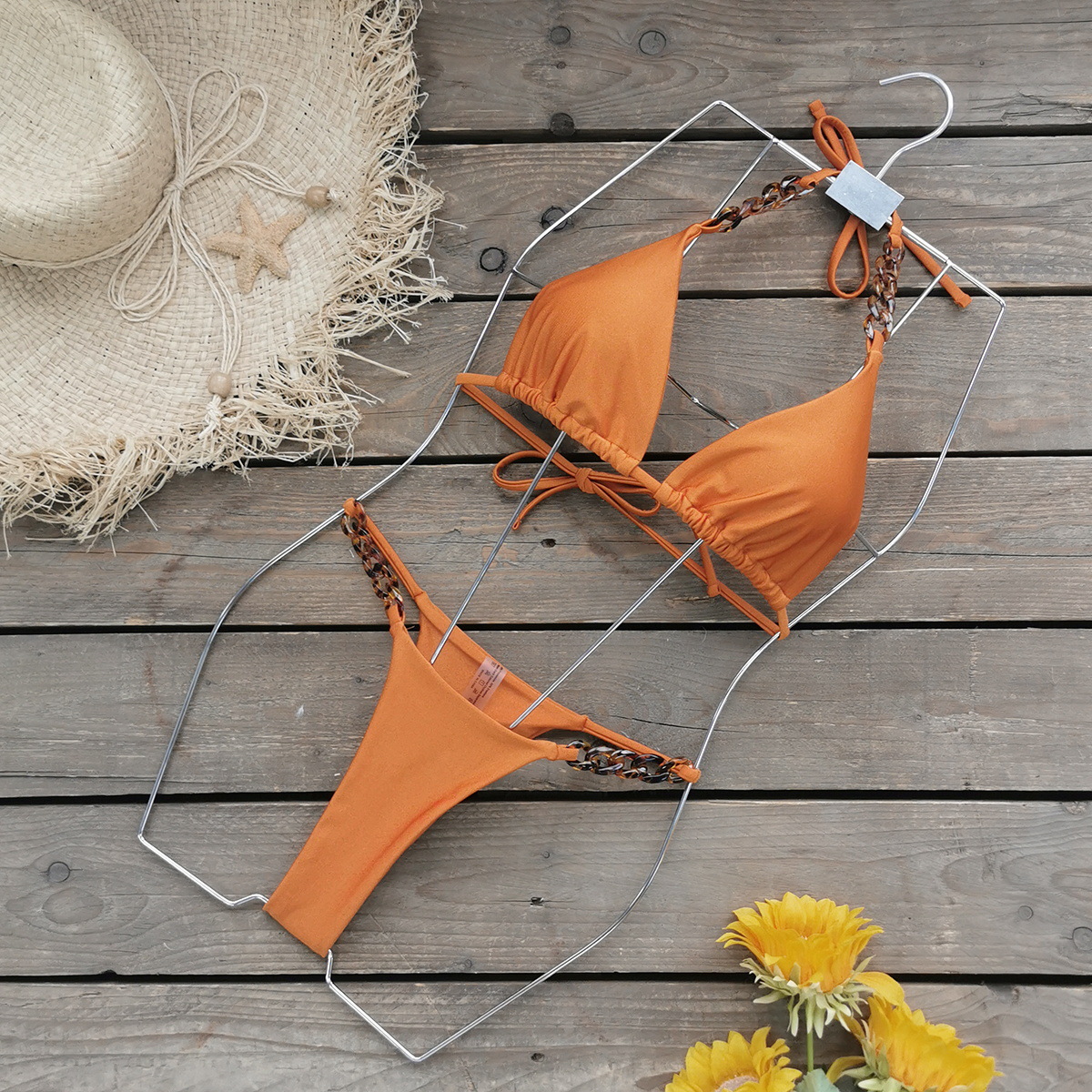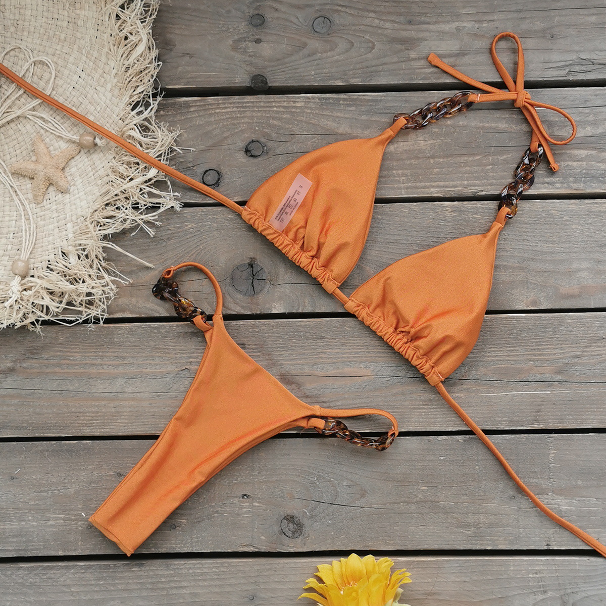Constructed from durable polyester, this solid-color bikini delivers a clean, minimalist silhouette for summer days at the beach or by the pool. The top features ruched cups and a backless design, secured by a three-point halter strap for adjustable, secure wear. Subtle tortoiseshell-style chain accents connect the straps, adding a refined detail while preserving a sleek look. The low-rise bottom provides contemporary coverage that complements the halter-style top for a balanced, flattering profile.