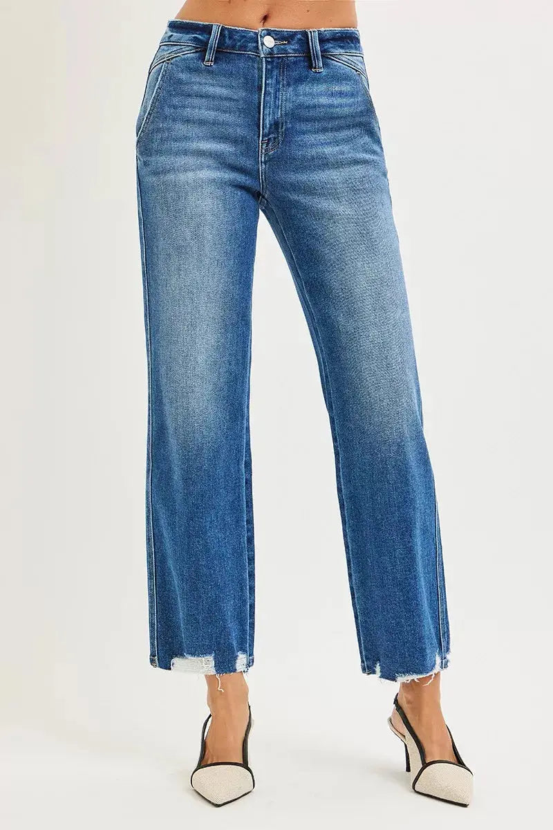 RISEN High Rise Ankle Straight Jeans With Distressed Hem Detail