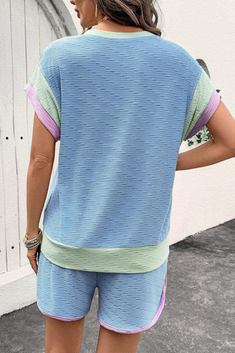 Beau Blue Corded Knit Contrast Trim Round Neck Cap Sleeve 2pcs Short Set - Love Salve
