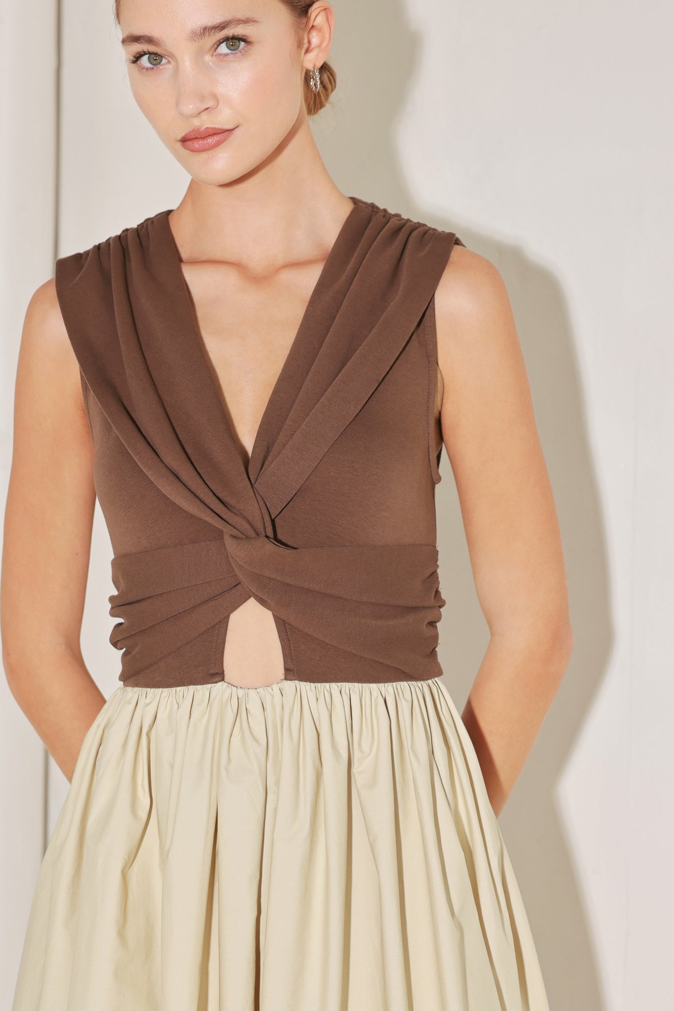 A solid midi dress featuring knit top with V neckline, sleeveless, twist front detail with cut out, full woven skirt and back zipper closure