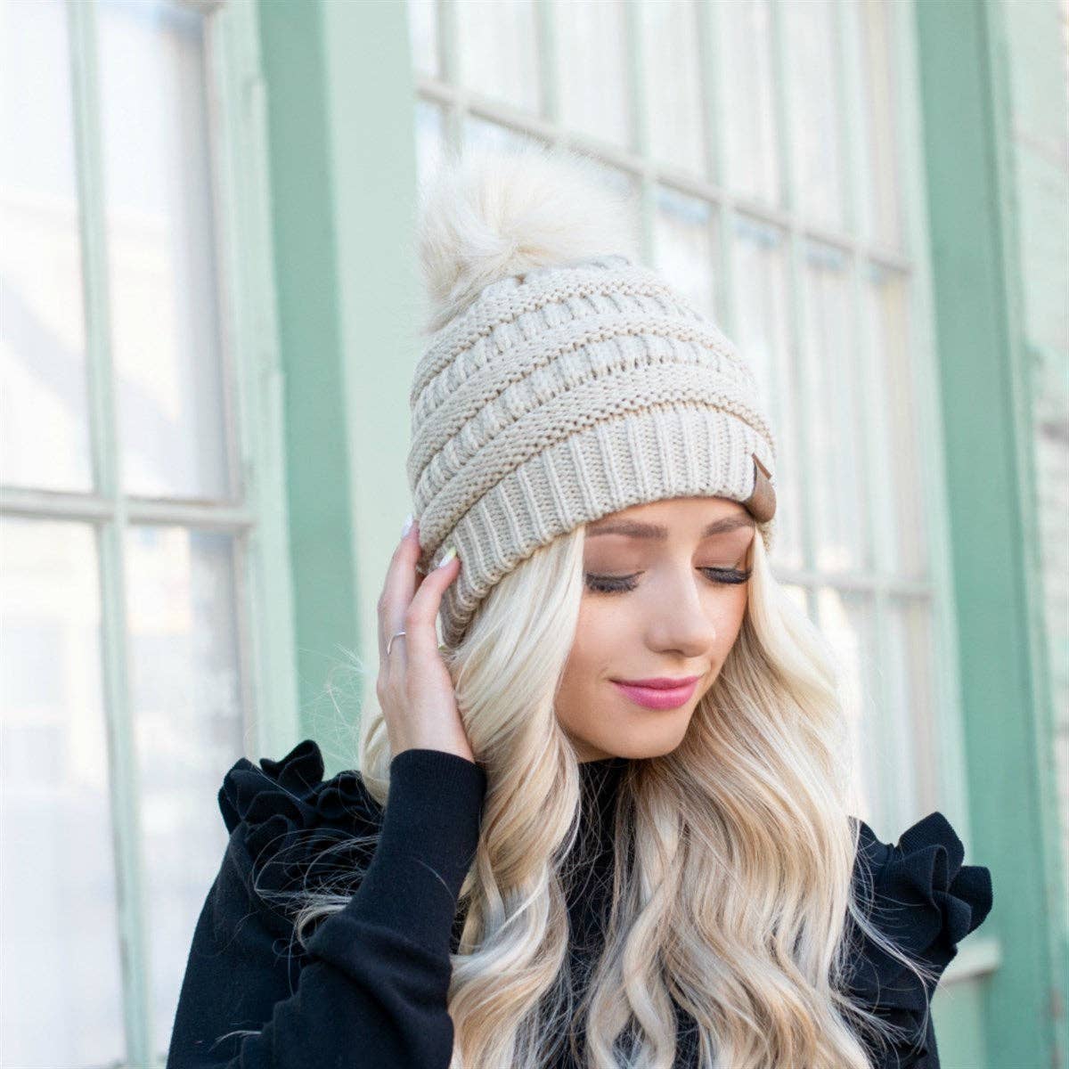 C.C Cable Knit Beanie with Matching Faux Fur Pom - Burgundy