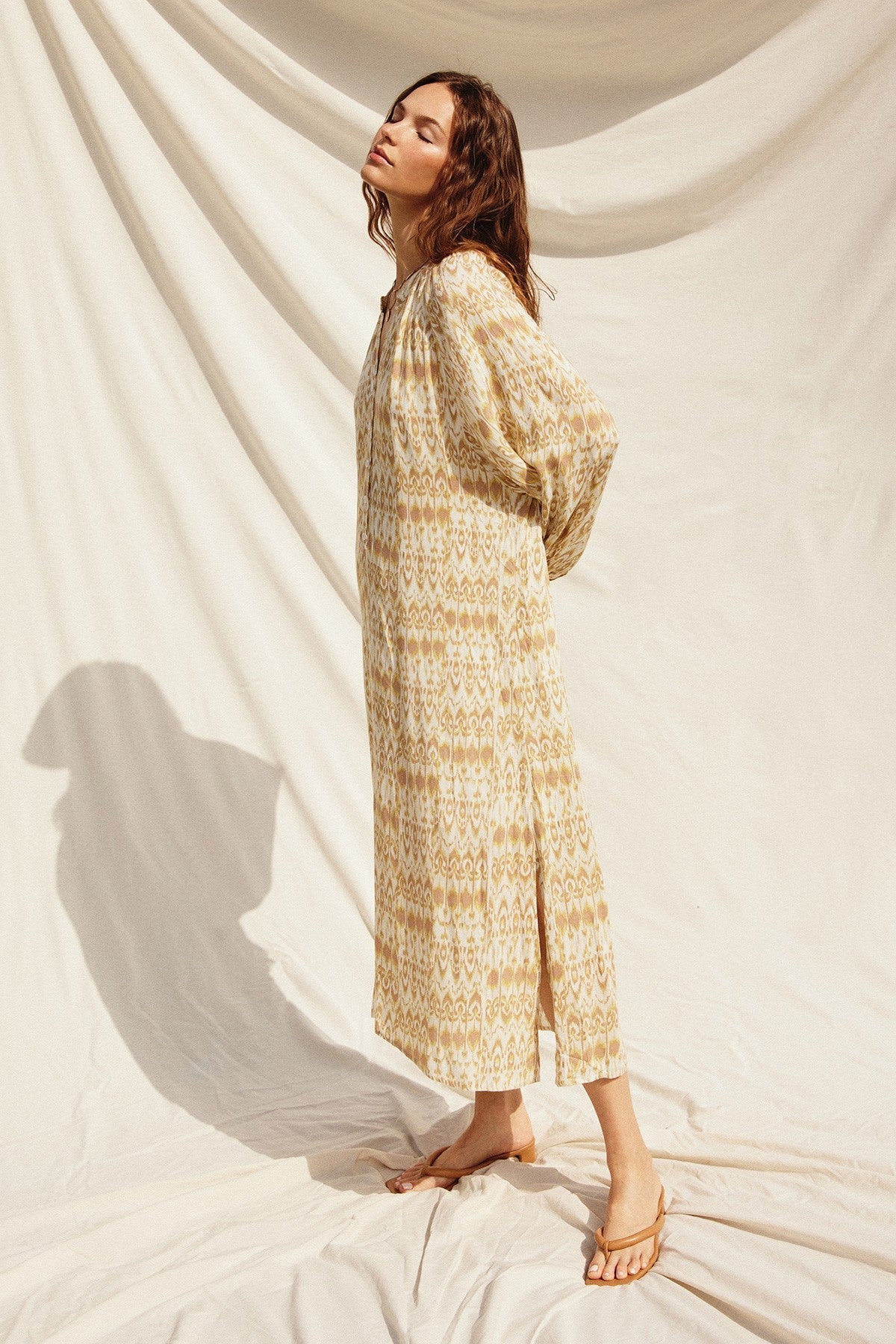 Cream Button Front Split V-Neck Side Slit Midi Dress
