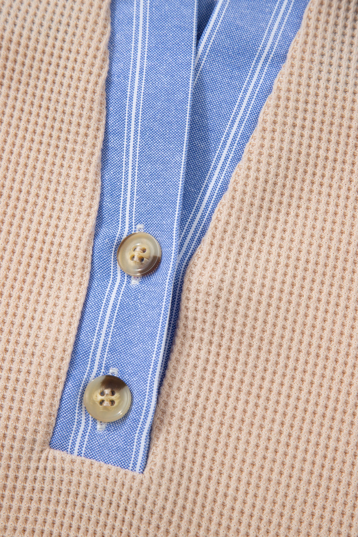 Plus Size Parchment Striped Waffle Knit Collared Top With Contrast Trim
