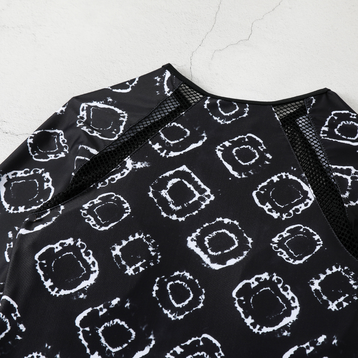 Key details: color is black with a white graphic print; season reflects summer wear; suitable for water activities like surfing and swimming. The long sleeves offer sun protection while maintaining a sleek, modern silhouette that transitions from water to shore with ease.