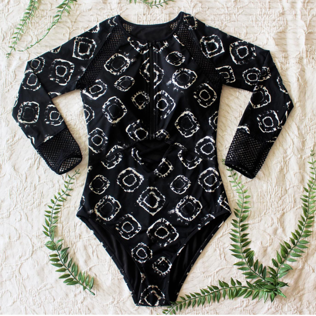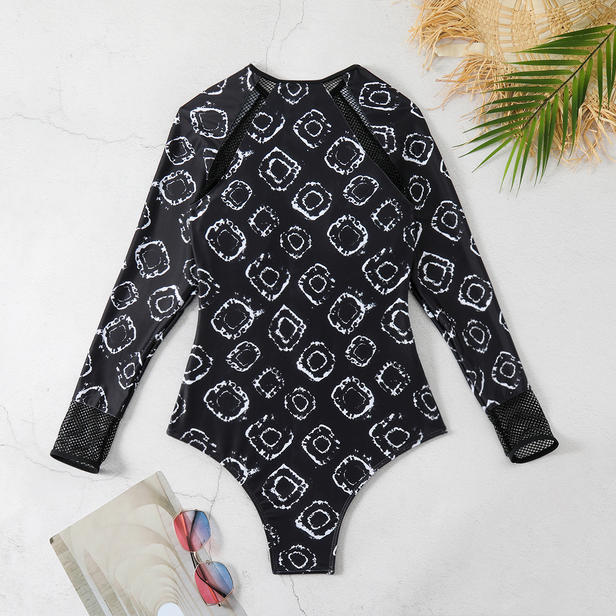 Experience a boho-inspired look for summer with this printed one-piece swimsuit for women. Designed with a long sleeve silhouette and a graphic pattern on a black base, it balances coverage with style for beach days, poolside lounging, or light surfing sessions.
