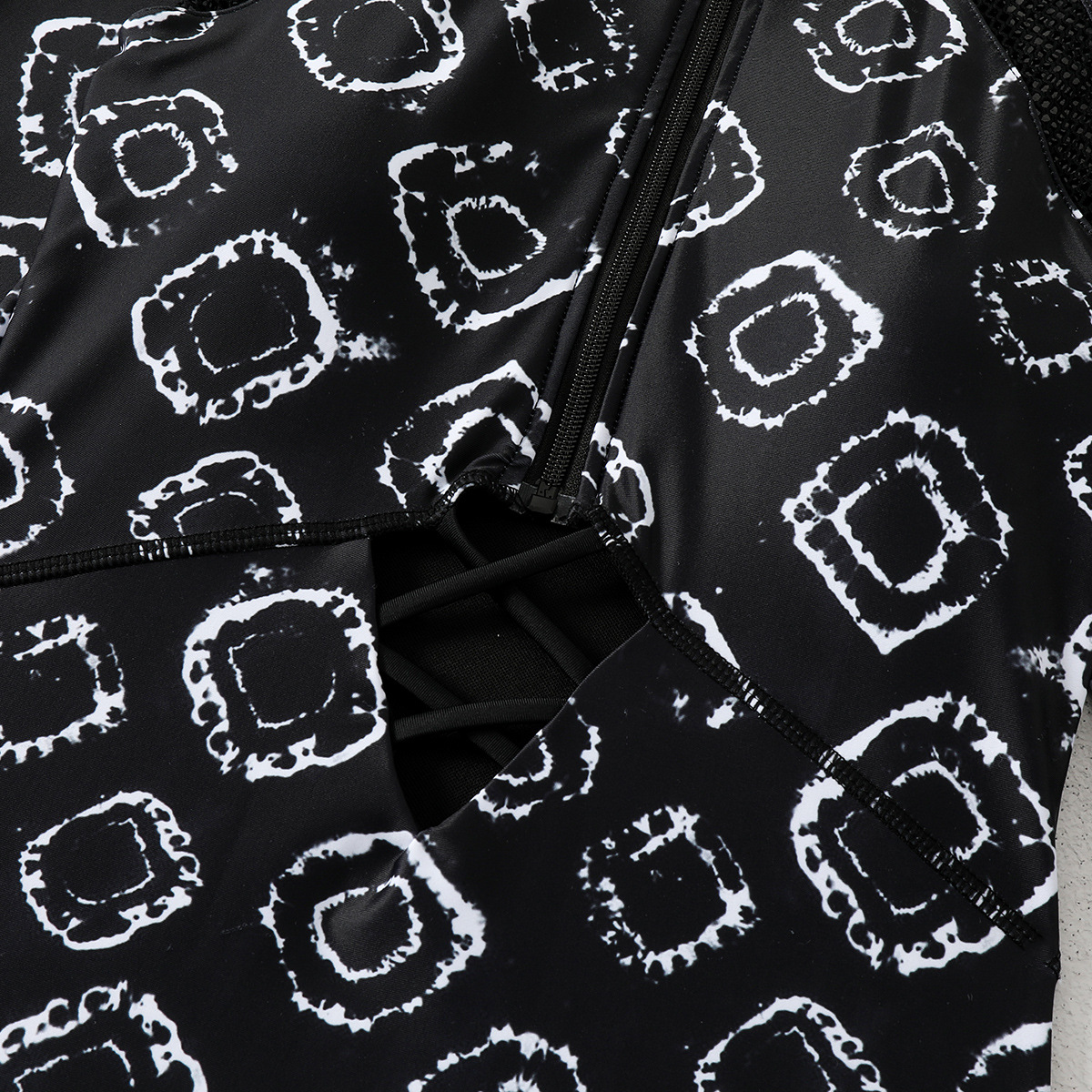 Fabric and construction: Made from durable polyester for comfortable stretch and quick-drying performance. The suit features a front zip placket, a bold hollow-out cutout at the midsection, and decorative criss-cross lattice ties that add texture and visual interest.