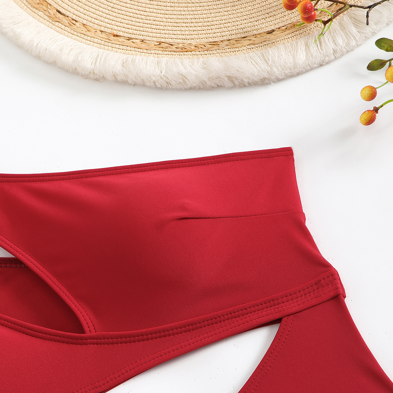 The swimsuit is crafted from polyester to deliver lightweight comfort, quick-drying performance, and durability for summer days at the beach or pool. Its solid black color emphasizes clean lines and a modern silhouette, while the design features an asymmetric neckline with hollow-out cutouts and a drawstring tie along the hip for adjustable shaping. The sleeveless, one-piece construction provides freedom of movement and a secure fit during swimming and sunbathing. This boho-inspired piece blends fashion and function, making it suitable for vacation wear and resort settings.