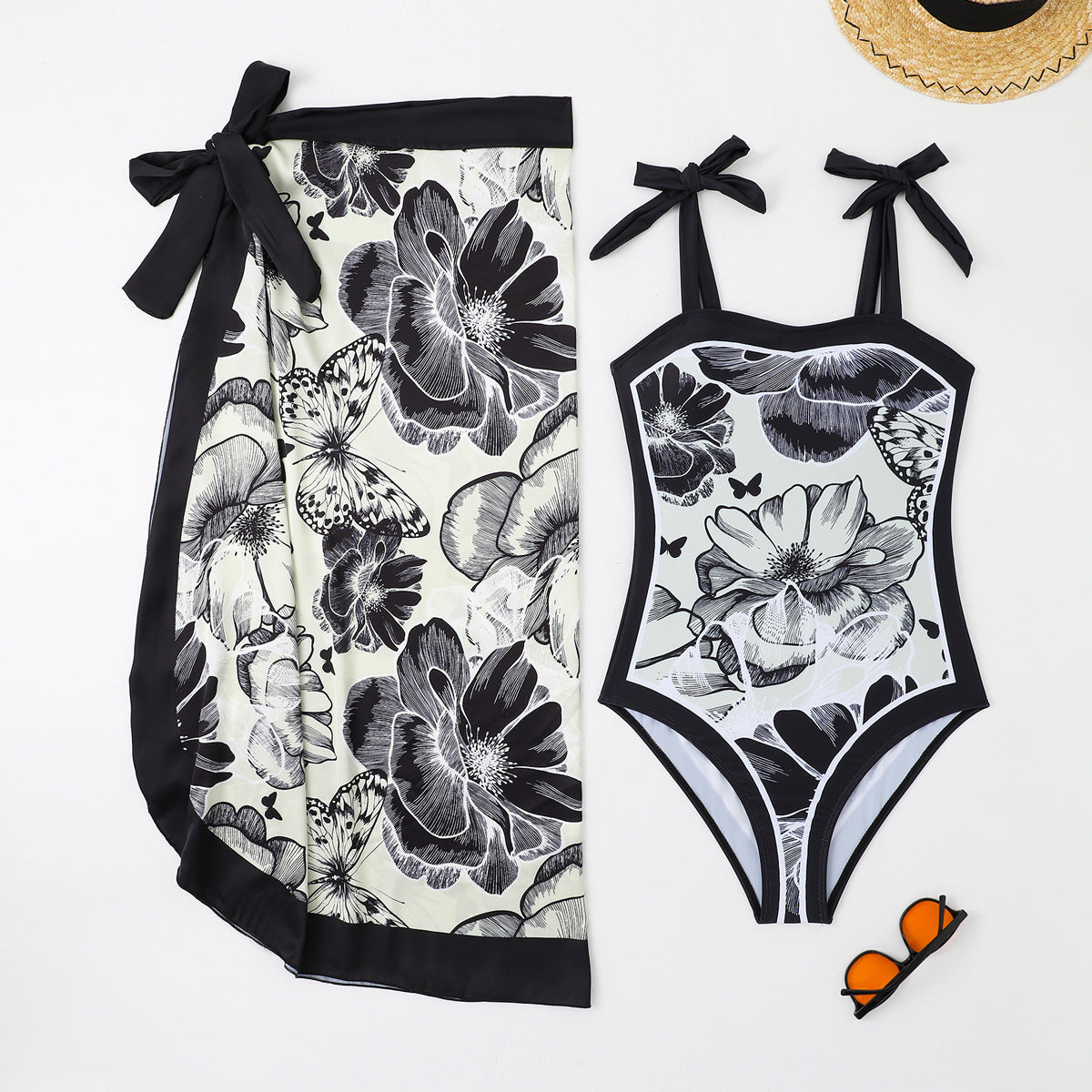 The wrap skirt ties at the waist with a bow, offering modest coverage when worn over the swimsuit. The ensemble provides a relaxed, conservative silhouette that pairs well with sun, sand, and sea. Ideal for resort getaways, pool parties, and everyday summer wear.
