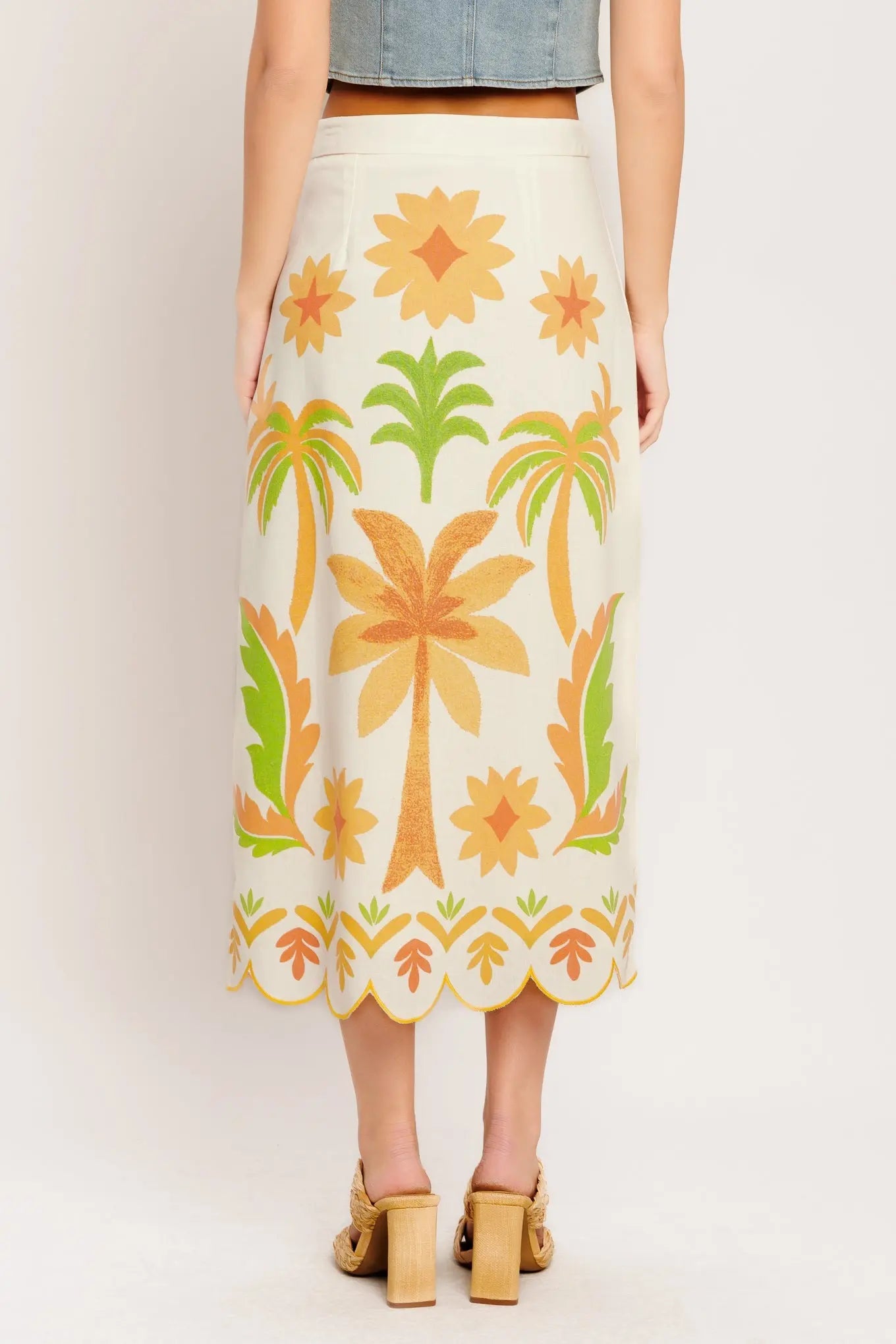 Palm Print Woven Midi Skirt With Scalloped Hem And Zipper Closure Flying Tomato