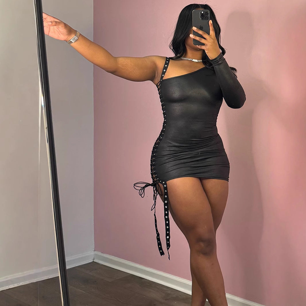 Women Clothing Dress Diagonal Collar Ribbon Hollow Out Cutout out Strap Single Side Long Sleeve Pullover Hip for Women