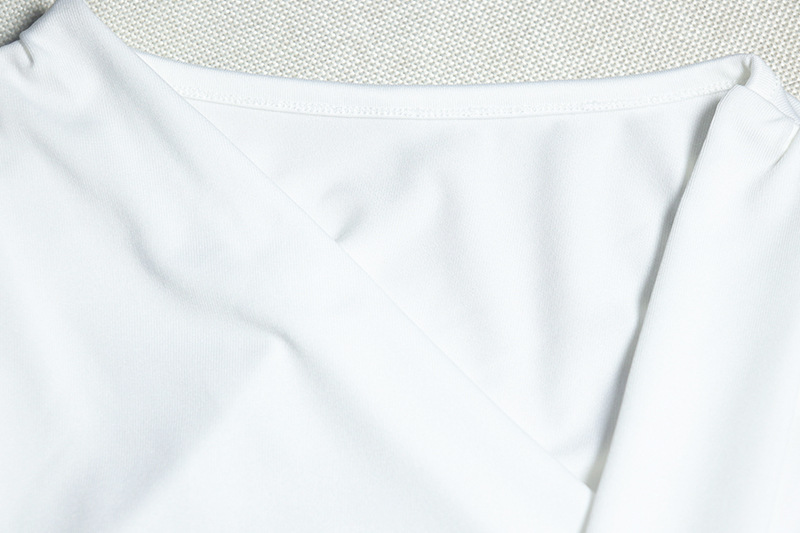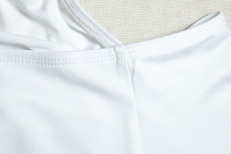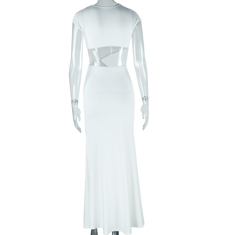 This solid-white maxi dress is crafted from polyester for a smooth drape and easy care. The design features a diagonal wrap neckline that creates an asymmetric silhouette, complemented by ruched detailing and cutout accents along the bodice. The sleeveless, backless style pairs a slim fit with a flattering waistline to enhance natural curves while maintaining comfort and ease of movement. The dress provides full-coverage length with a sleek, elongating silhouette, making it suitable for warm-weather events and evenings out.