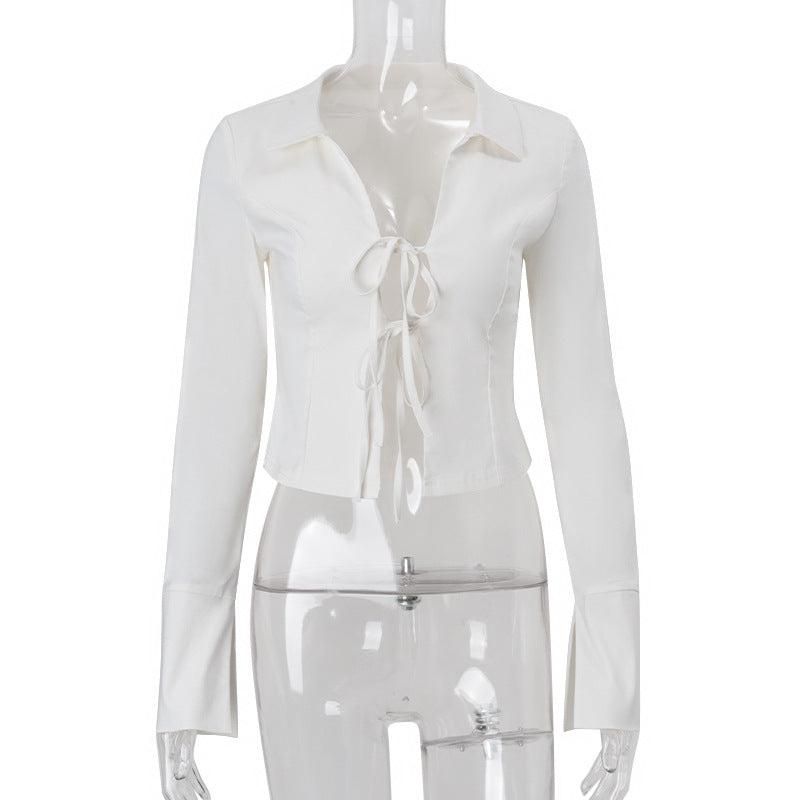 Women Clothing Autumn Street Polo Collar Cardigan Strap Long Sleeve Shirt Top
