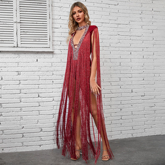 Sexy Deep V Plunge Luxury Rhinestone Tassel Dress Party High End Dinner Performance Dress