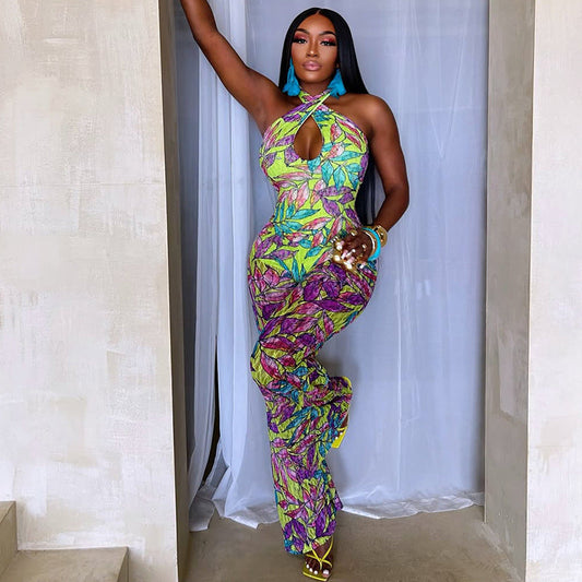 Women Printed Loose Comfortable Fitted Waist Jumpsuit Cross Halterneck Hollow Out Cutout Backless Sexy Jumpsuit