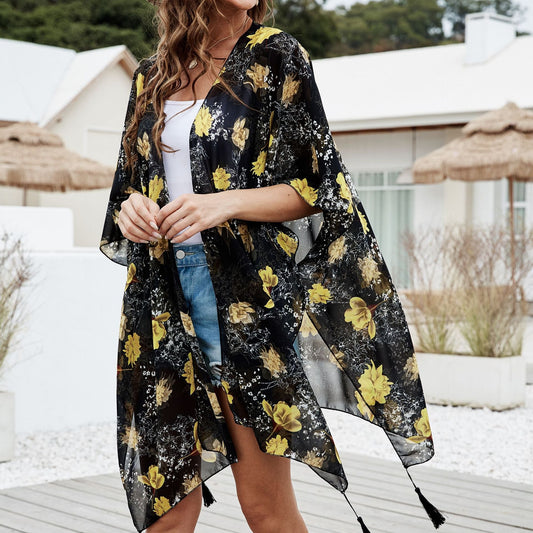 Summer Colorful Floral Print Tassel Sunshade Casual Sun Proof Sun Protection Clothing Mid Length Blouse