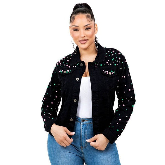 Pearls Rhinestone Black Denim Jacket Black PG