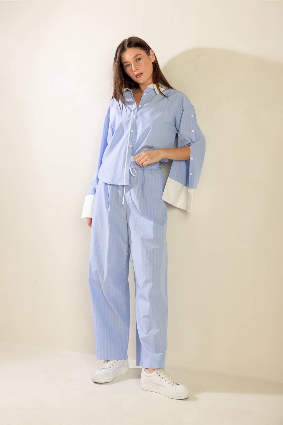 Details include an elastic waist with a functional drawstring for an adjustable fit, and a full-length rise of approximately 24 inches. The garment finishes in a soft light blue with subtle pinstripes for a refined, everyday look.