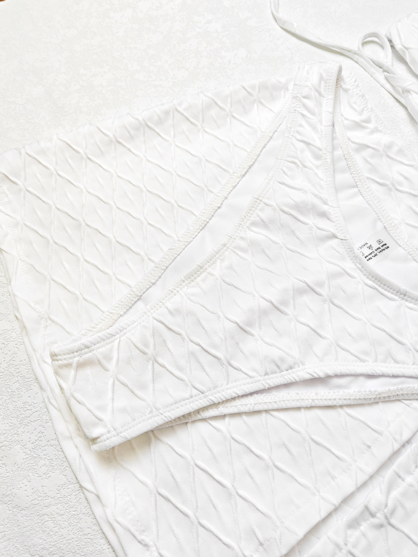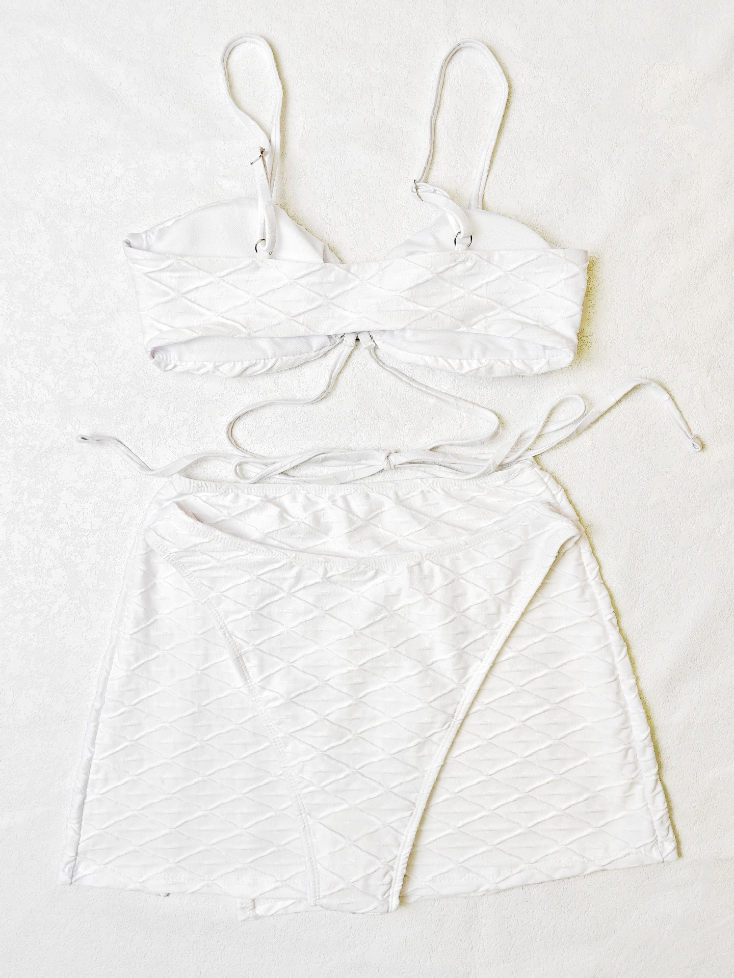 Designed for sunny getaways, this Love Ring Plaid Three Piece Outer Skirt Bikini Swimsuit combines a three-piece layout with a solid white color. The textured polyester fabric provides a flattering silhouette, with a bralette-style top that features a center ring detail and ruching for subtle shaping. Regular straps and a secure waist tie ensure a comfortable, reliable fit, while the included outer skirt completes the three-piece ensemble for versatile beachwear. Suitable for poolside lounging and coastal adventures, this swimsuit pairs easily with cover-ups and sunwear.