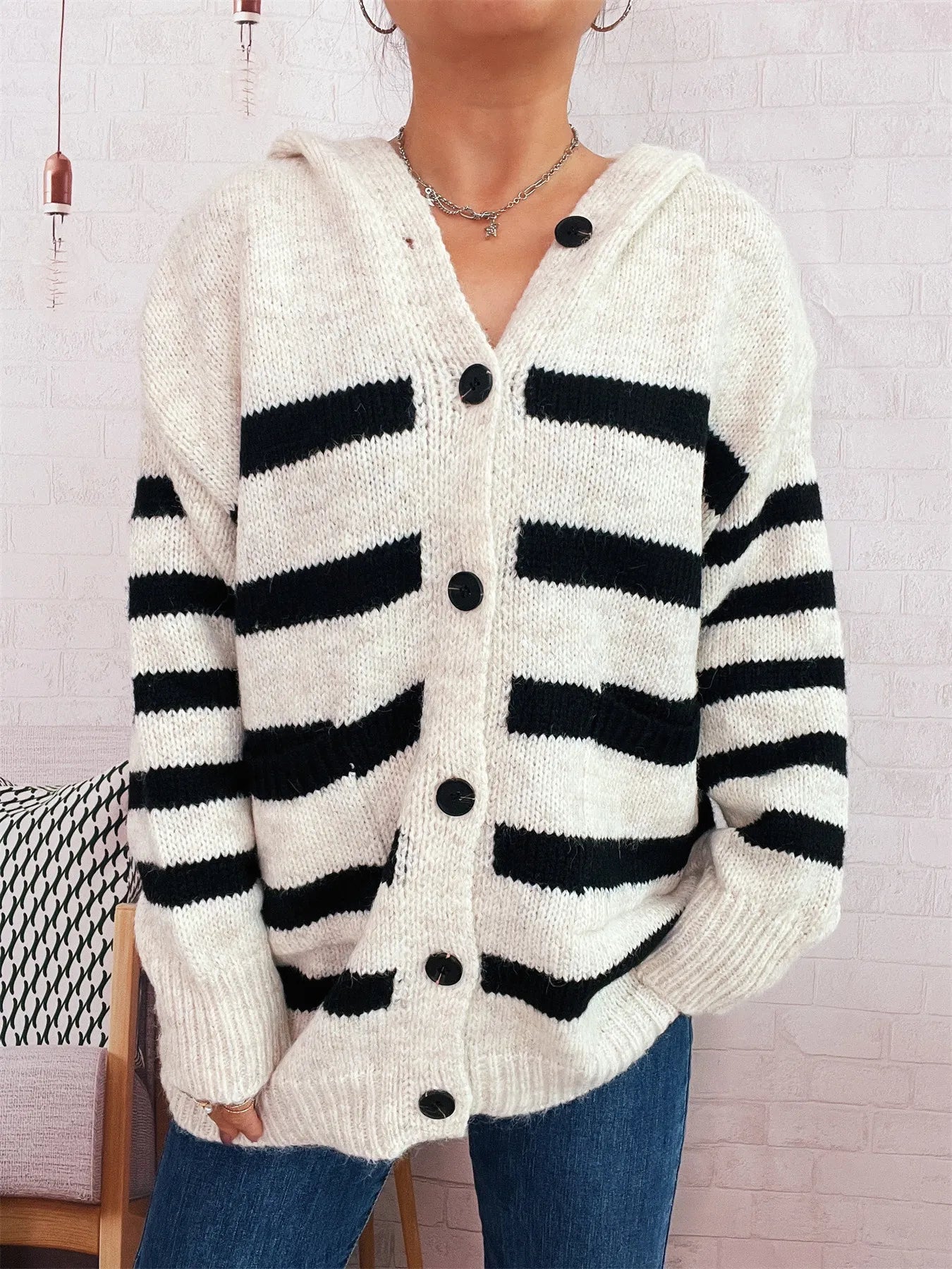 Oversized Striped Button Up Hooded Cardigan Loose Fit