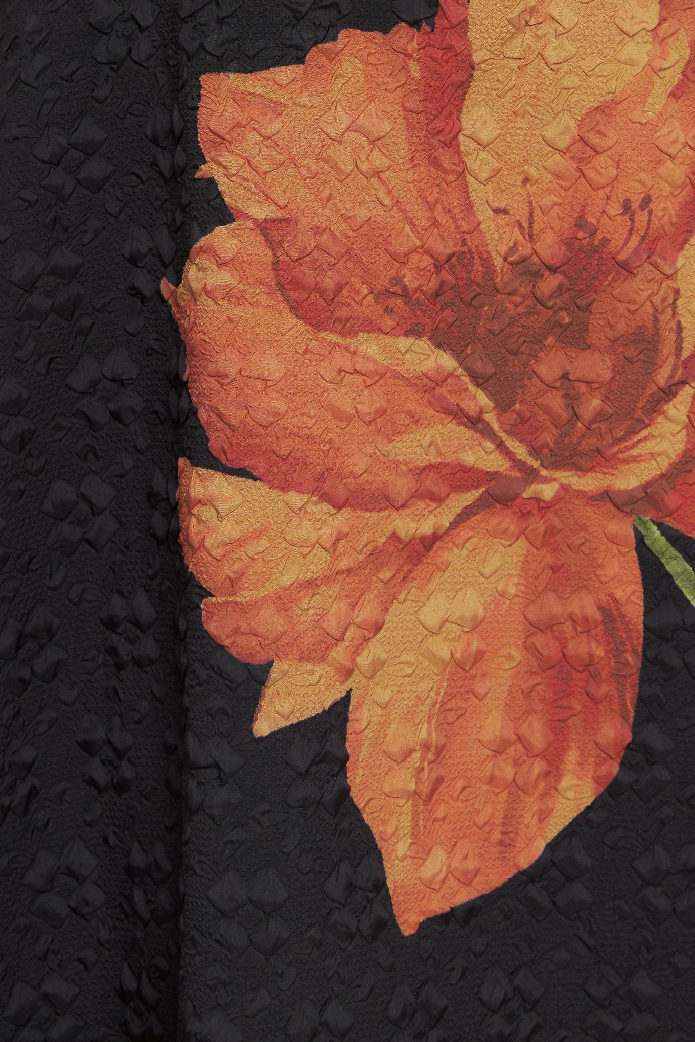 A printed textured woven midi dress featuring strapless, circle skirt and back zipper closure