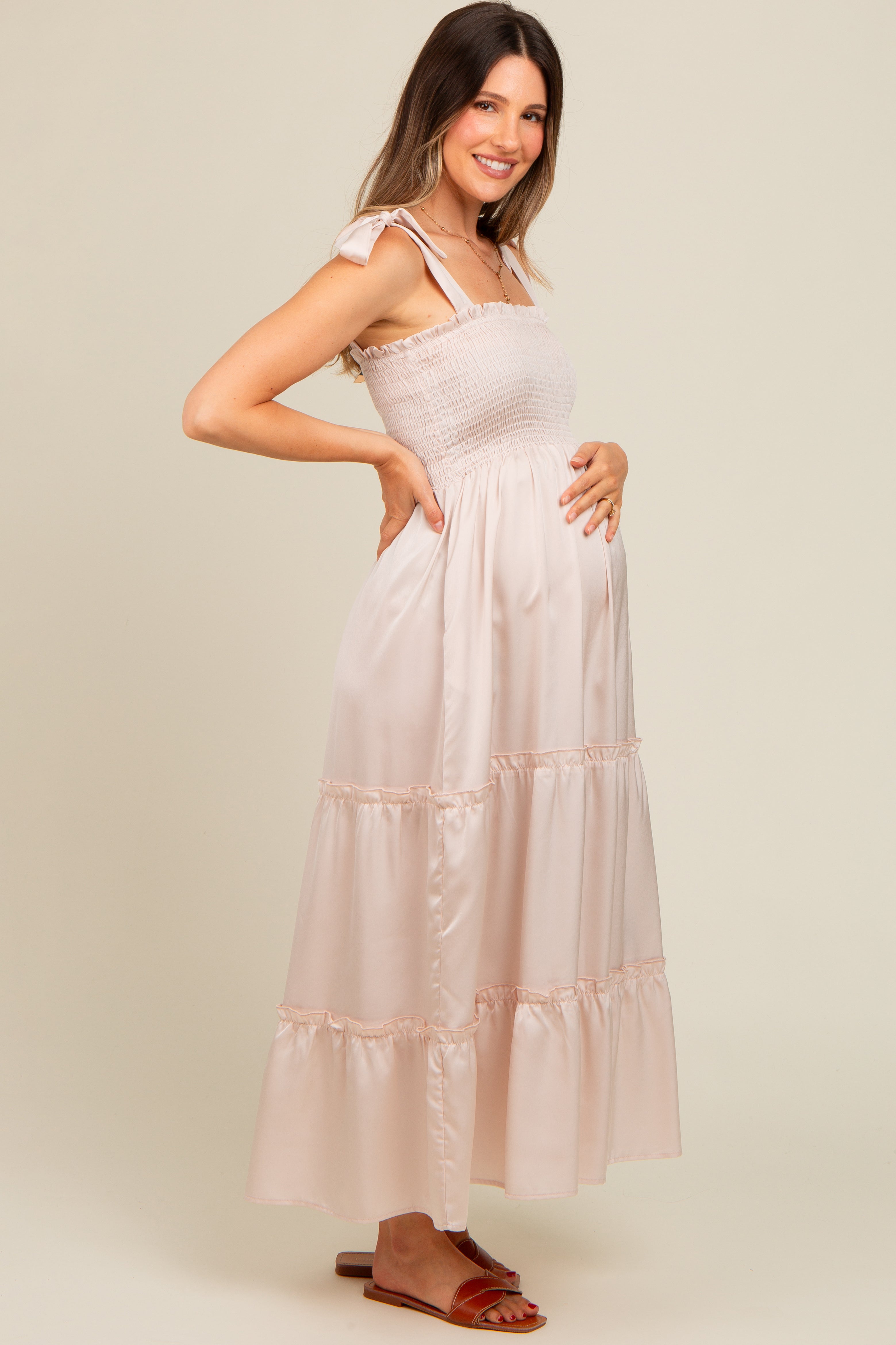 Beige Satin Smocked Maternity Maxi Dress PinkBlush