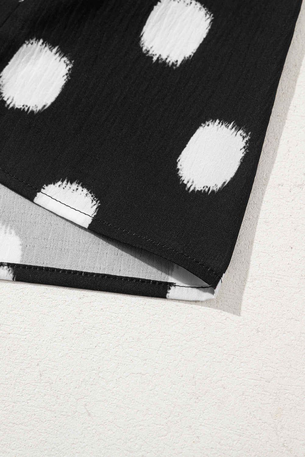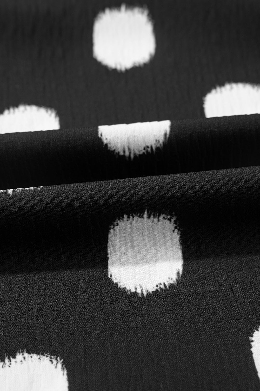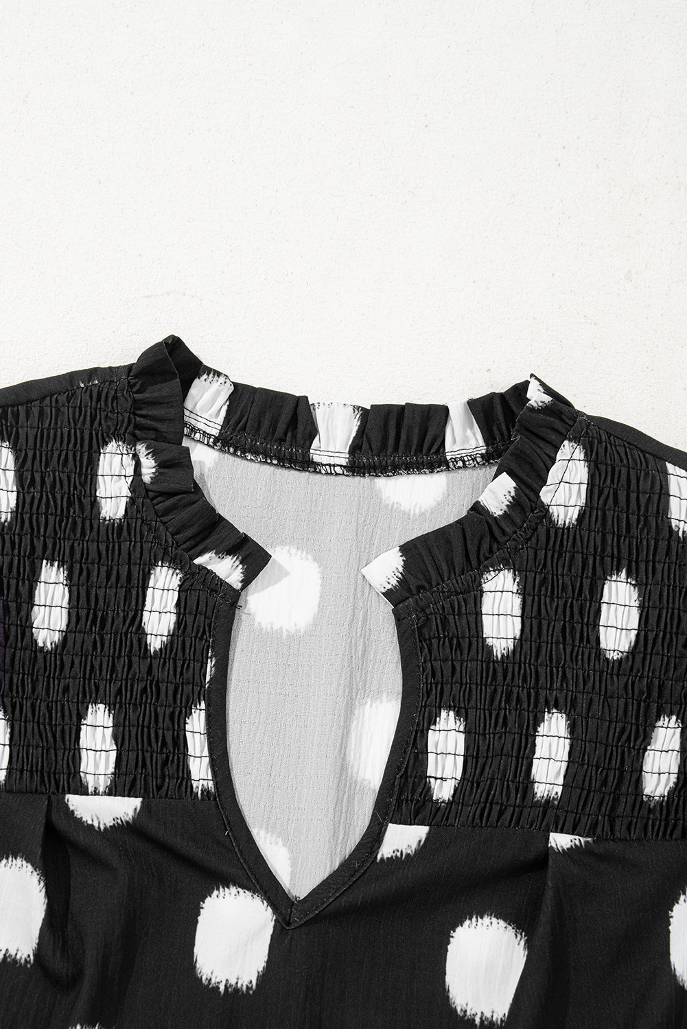 Black Polka Dot Print Smocked Notched Neck Balloon Sleeve Blouse