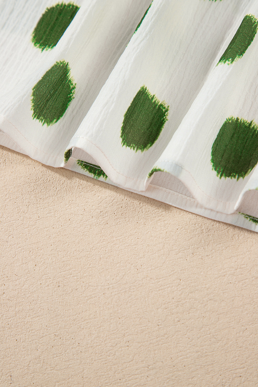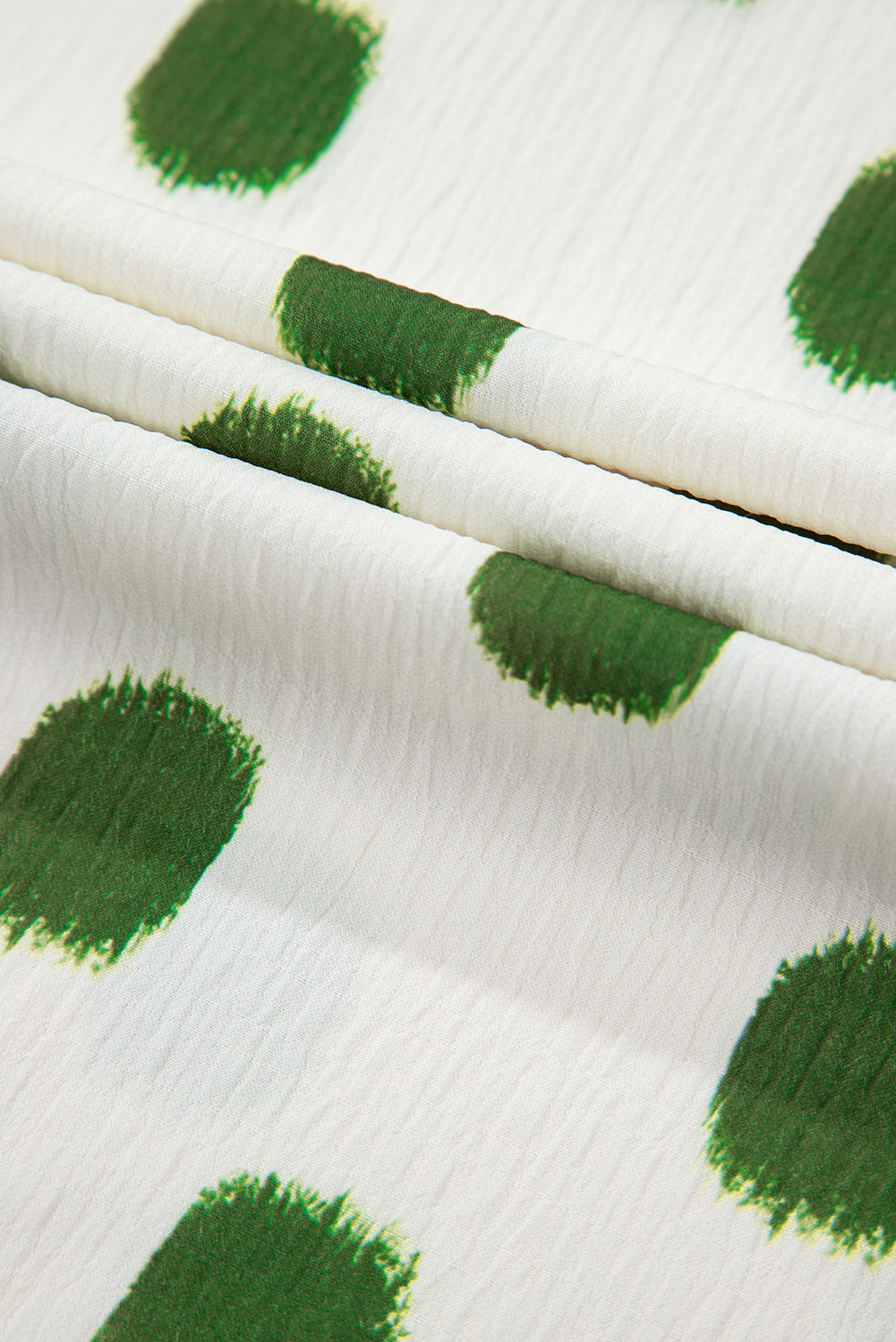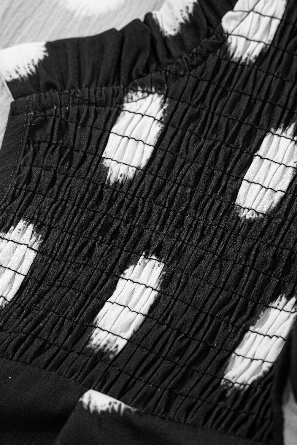 Black Polka Dot Print Smocked Notched Neck Balloon Sleeve Blouse