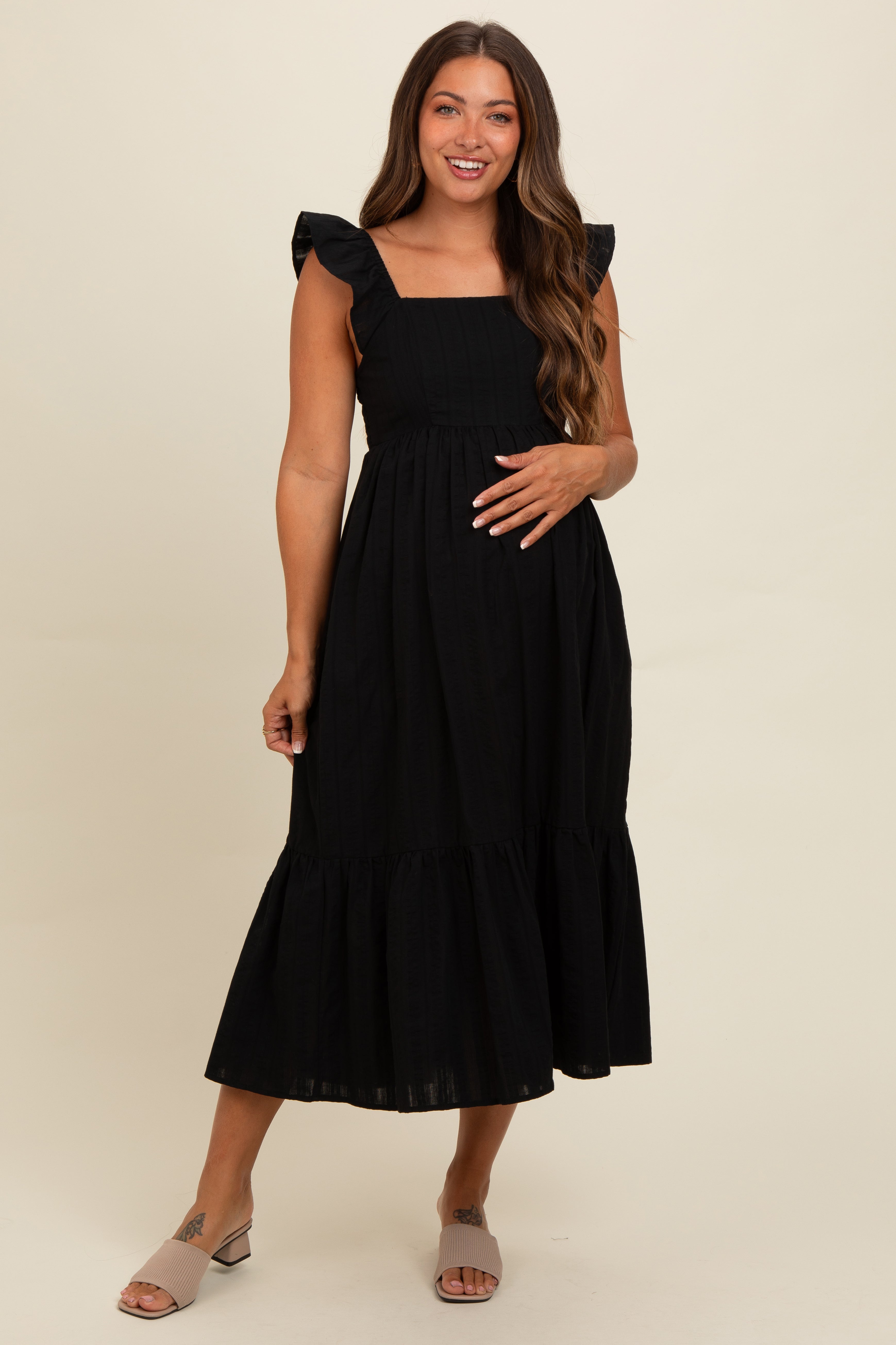 Effortlessly stylish and oh-so-comfortable, our Black Textured Cotton Ruffle Strap Maternity Midi Dress is your new maternity must-have. Made from lightweight, breathable textured cotton, this dress keeps you cool and comfy at every stage. The charming ruffle straps add a touch of feminine flair, while the flattering midi length ensures coverage and confidence. Designed to grow with you, this versatile dress fits your bump beautifully and looks stunning for any occasion—dress it up or down! Perfect for baby showers, brunch, or a day out, you’ll love reaching for this chic maternity staple again and again.
