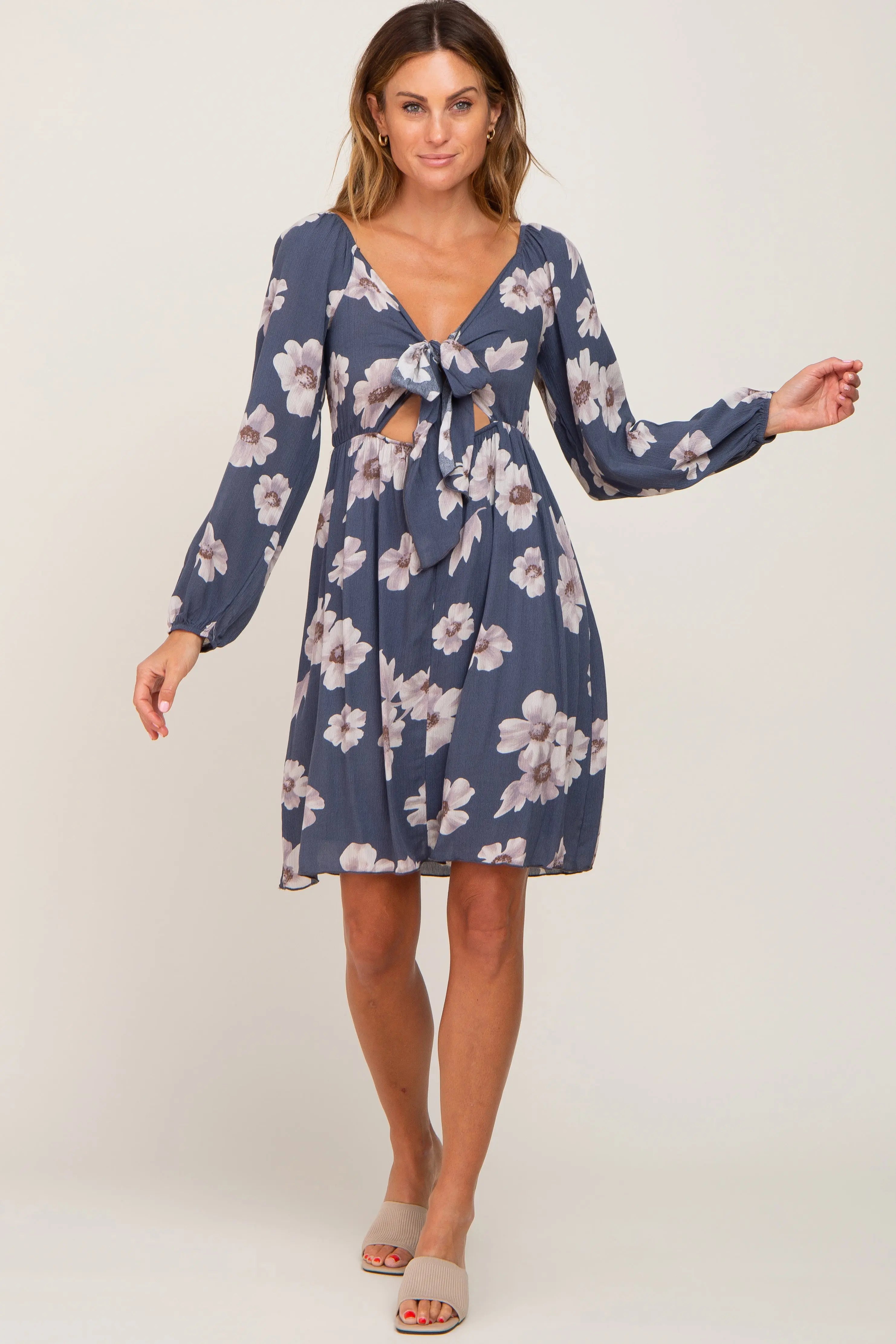 A floral dress with long cinched sleeves, a squared neckline, a smocked bodice, an open back and a tie back closure. Skirt is lined for coverage.