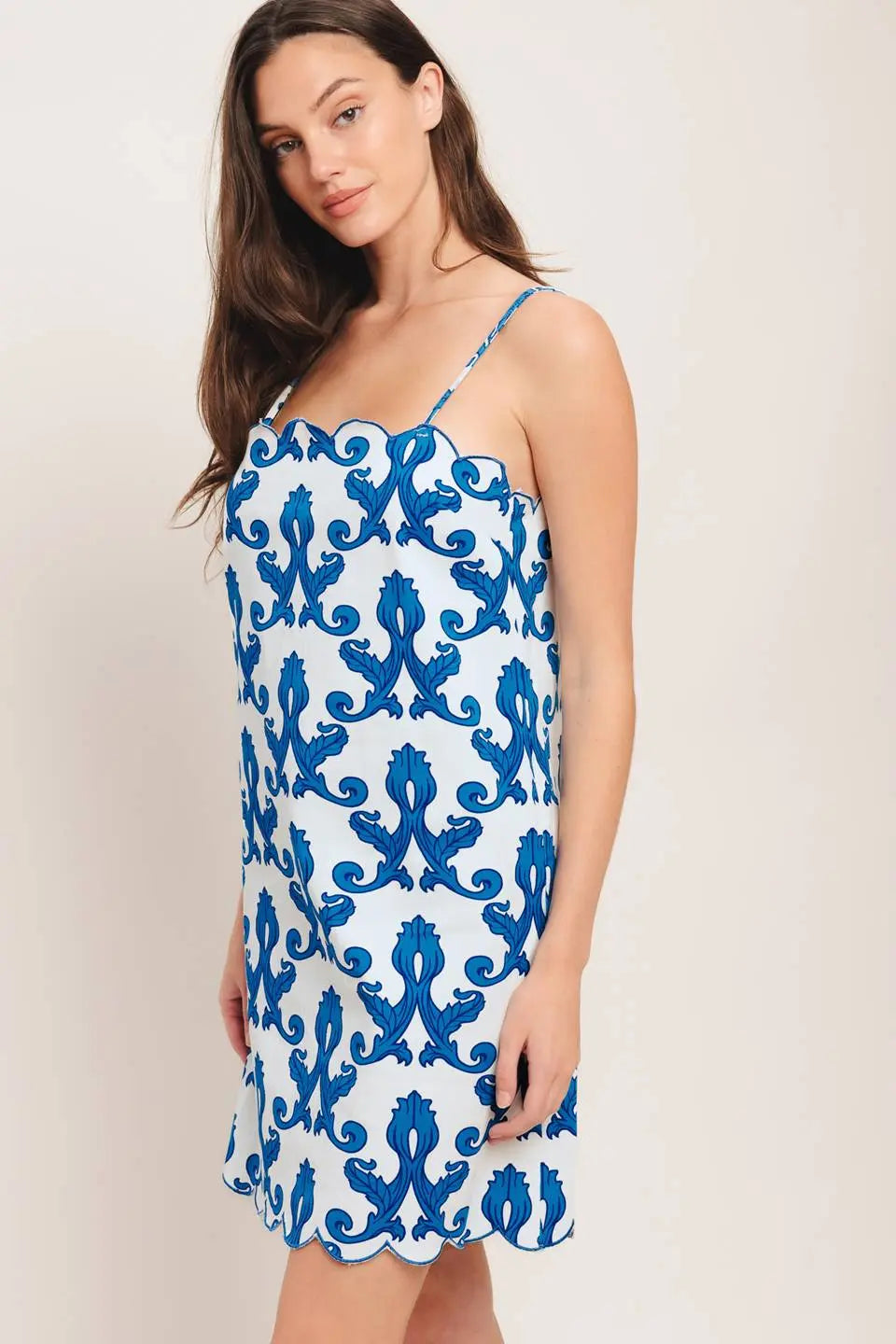 A printed woven mini dress featuring straight neckline, straps, scallop edge and back zipper closure