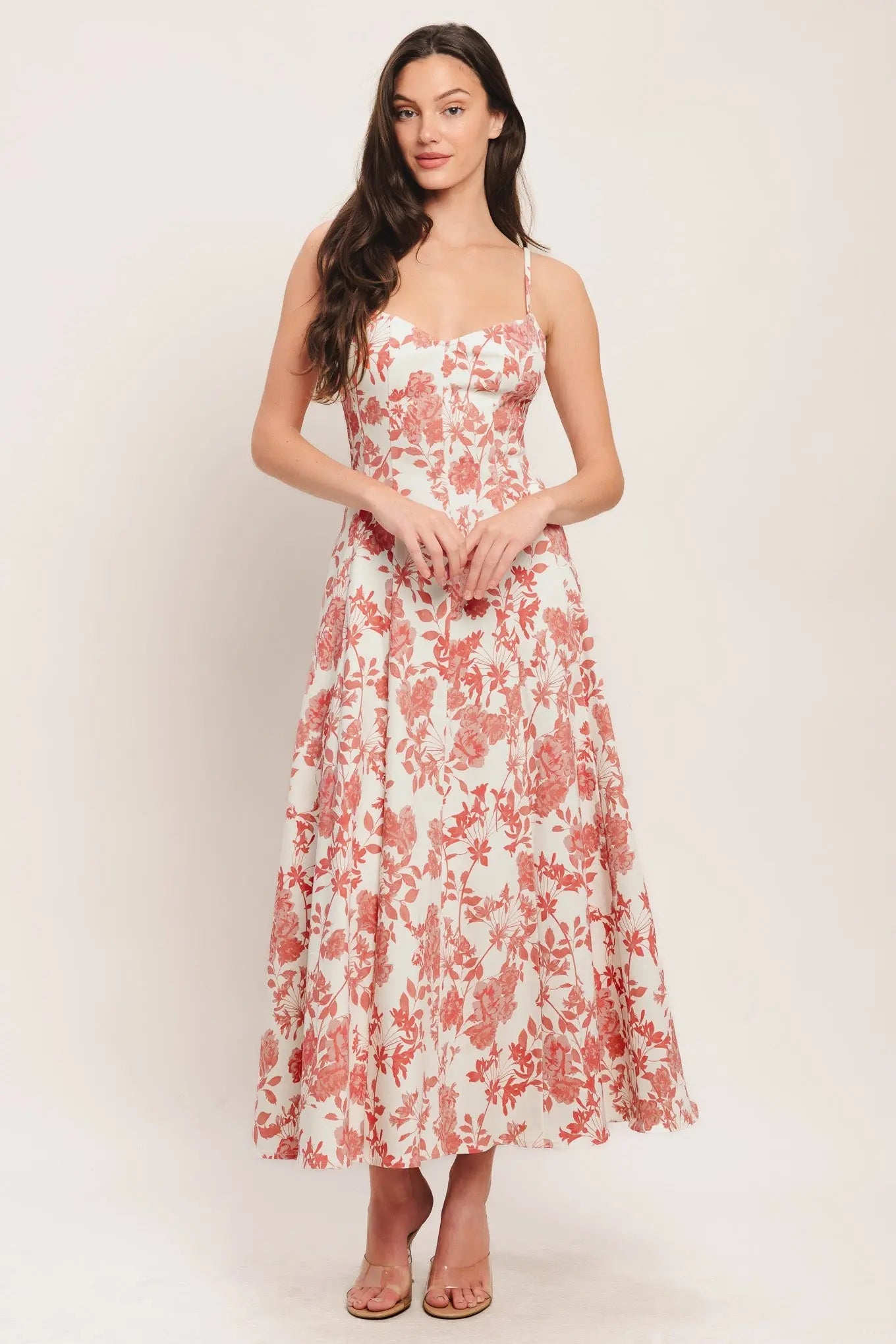 A printed woven midi dress featuring cami top, circle skirt and back zipper closure