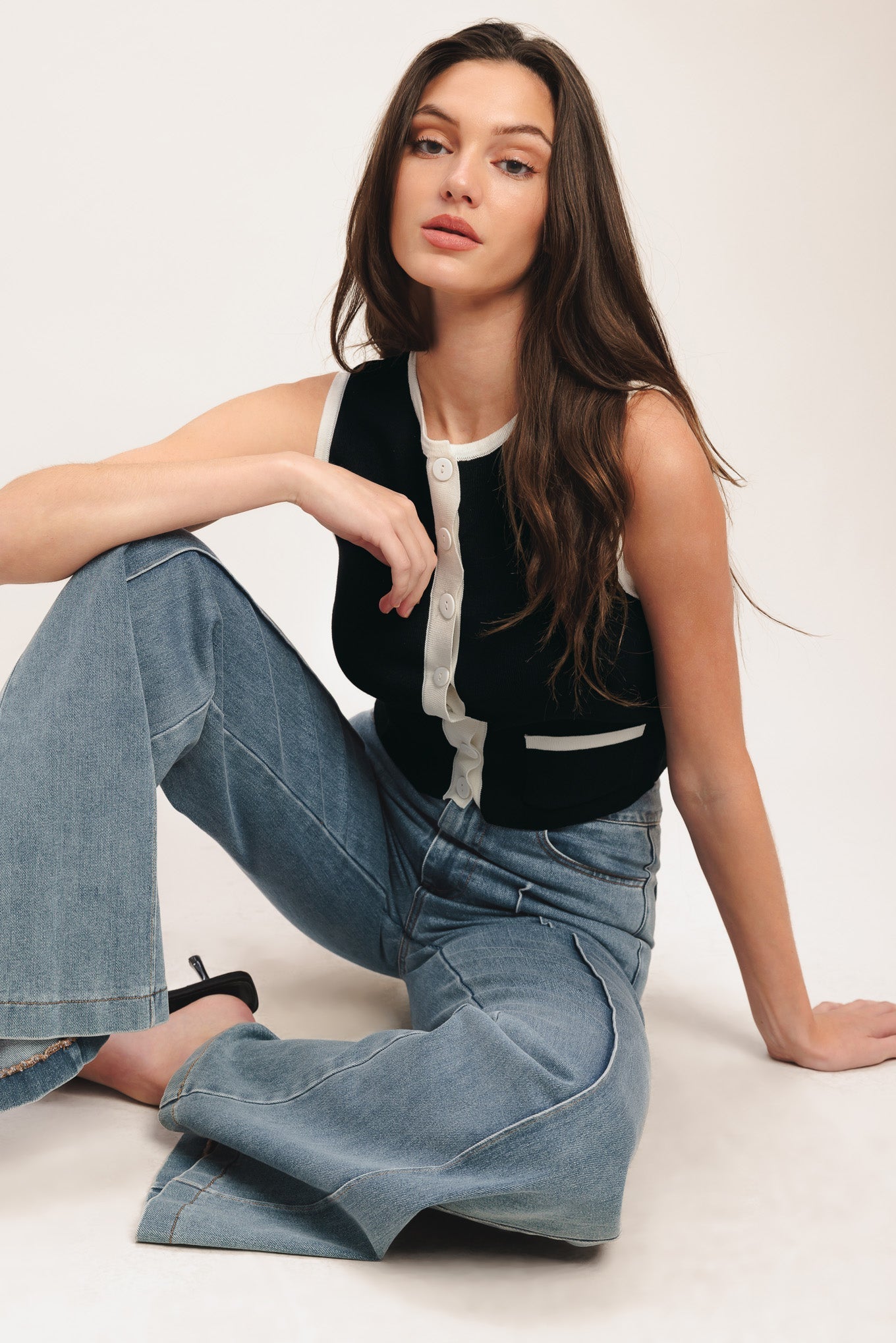 A color blocked sweater knit top with round neckline, sleeveless, front pockets and button down