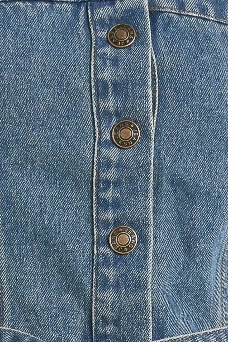 A washed denim high low midi dress featuring strapless, front button down, self tie and pockets