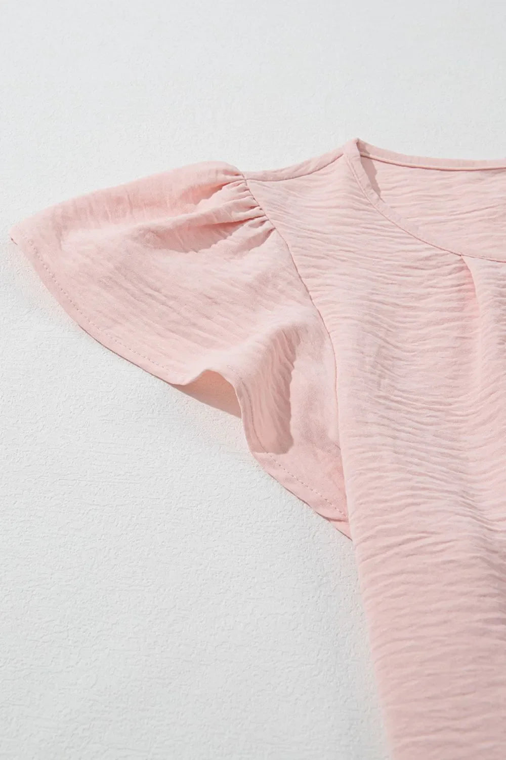 Solid Color Flounce Sleeve Pleated Round Neck Blouse