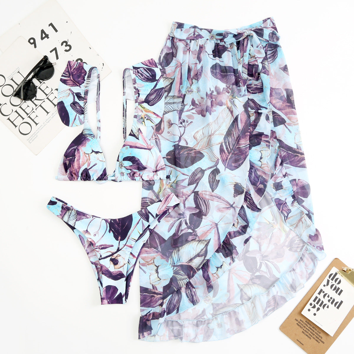 Women printed split sexy double sided mesh triangle bikini swimsuit three piece set