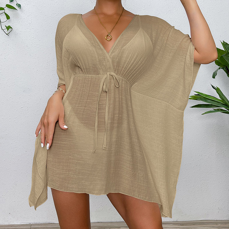 The solid sand-beige beach cover-up is crafted from lightweight polyester fabric, offering a soft, breathable layer over swimwear. Its drop-shoulder silhouette and short sleeves provide a relaxed, boho-inspired look designed for summer wear.