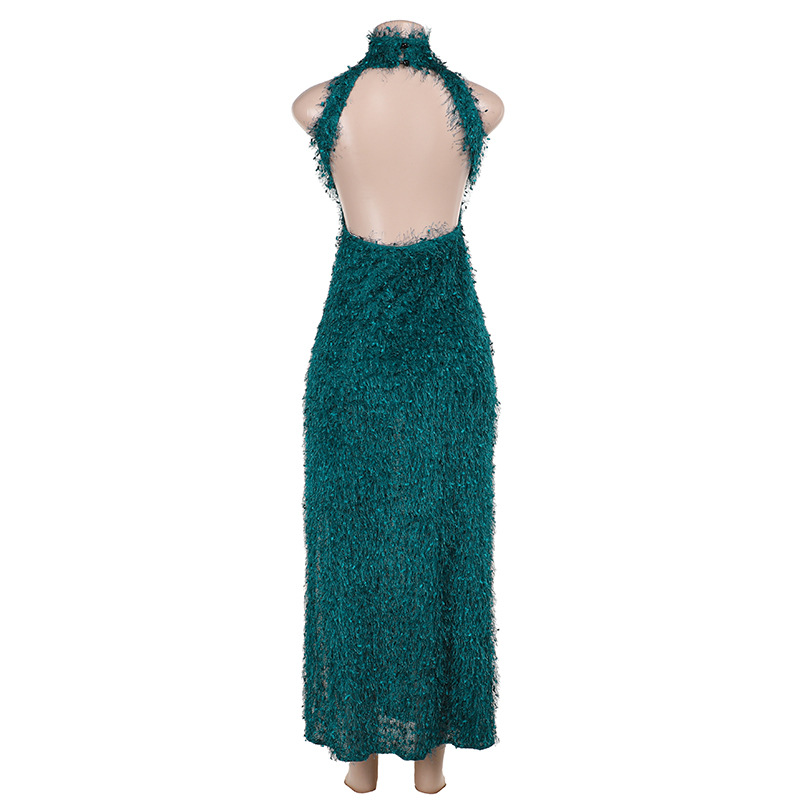 Halter Fur Texture Split Backless Dress Women Sexy Slim Fit Hip