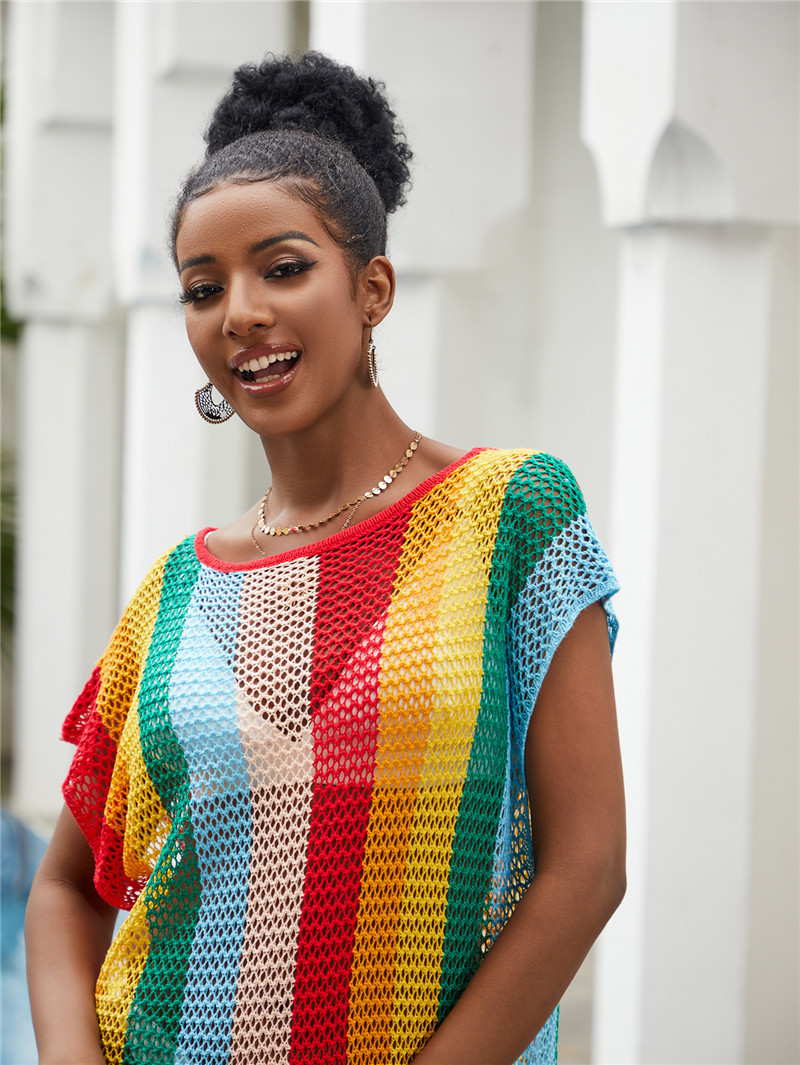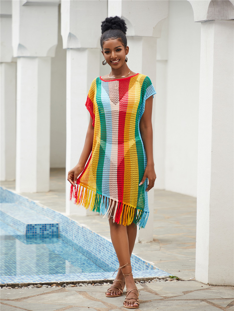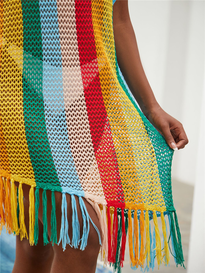 Knitted Striped Beach Blouse Sexy Hollow Out Cutout Tassel Holiday Sun Protection Shirt Beach Cover Up
