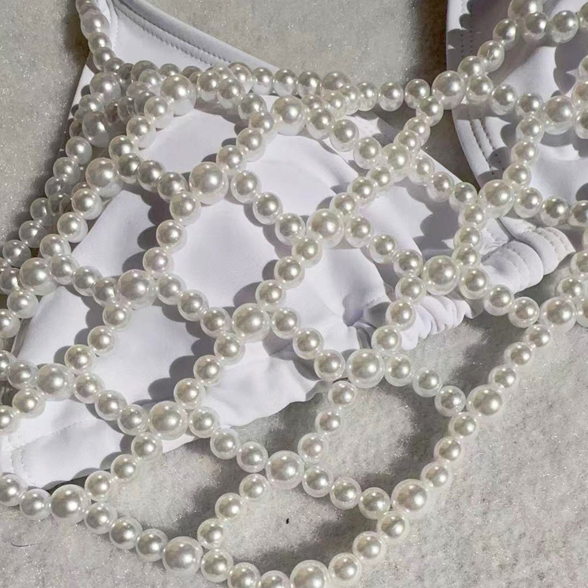 Pearl Chain Tied Swimsuit Women Sexy Bikini Advanced Split Three Piece Set
