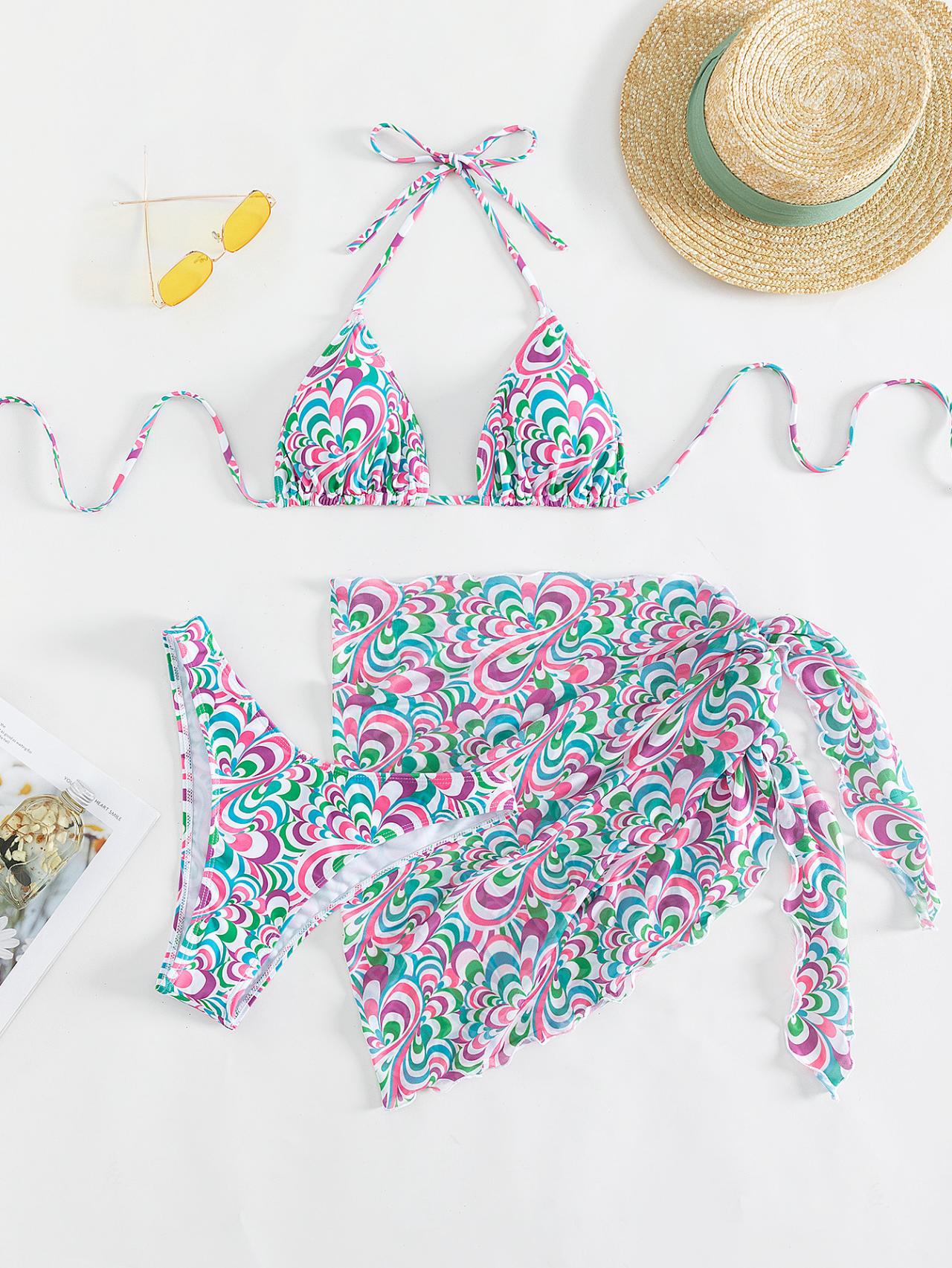 Set includes: Top, bottom, and wrap skirt in a cohesive print. Season: Summer; suitable for beachwear and swimming activities.