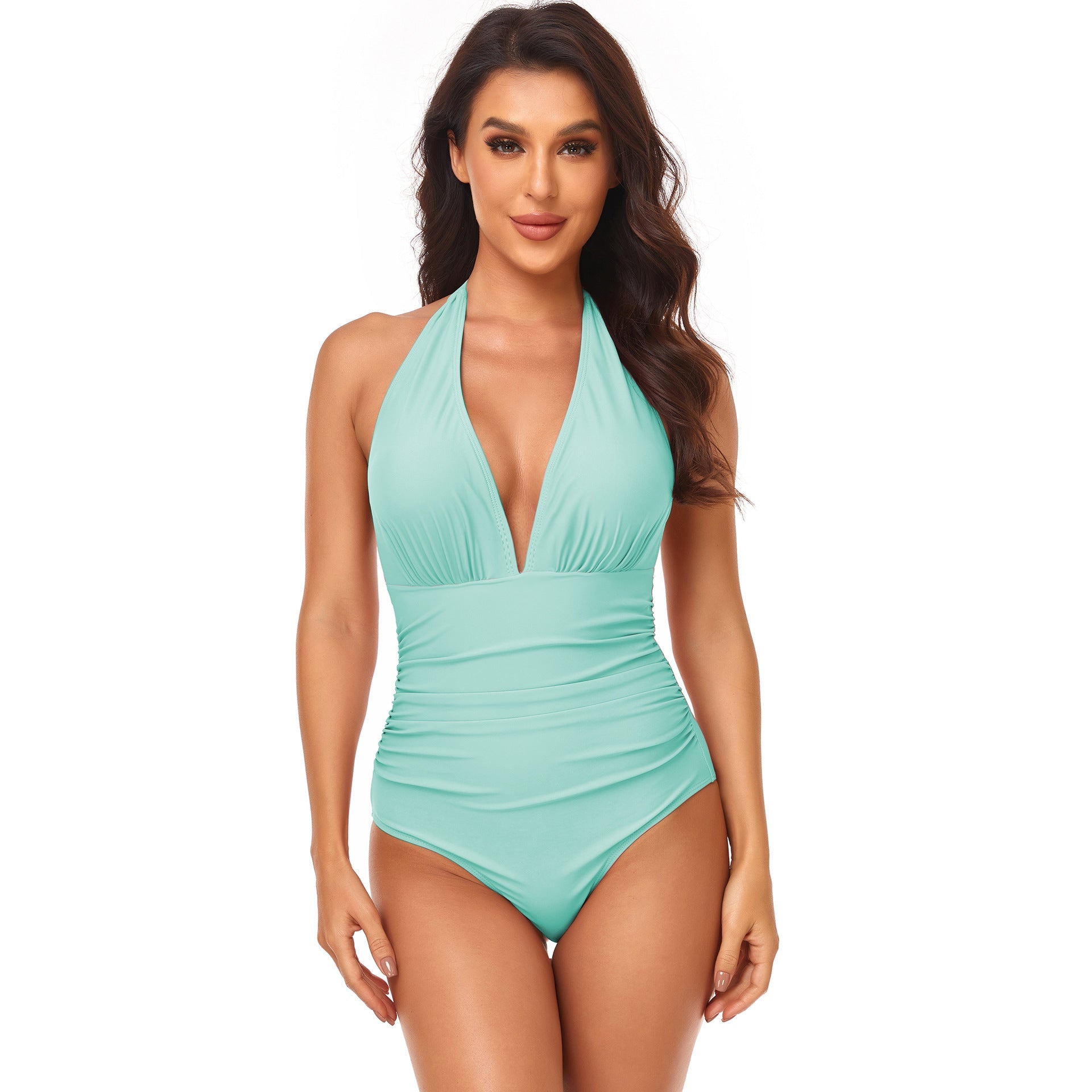 Solid Color One Piece Swimsuit Pleating Halter Swimsuit Popular One Piece Swimsuit