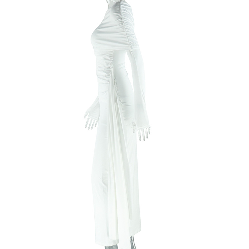 This solid color maxi dress features a diagonal, one-shoulder neckline with an open shoulder cut, creating an asymmetric silhouette with draped lines. The long sleeves balance the slim, bodycon fit for a sophisticated party or club look. Crafted from polyester, the dress offers a smooth drape and comfortable stretch. A ruched detail along the side adds texture and enhances the silhouette, while the maxi length provides full coverage with a flowing side drape for movement. The solid color ensures versatile styling with metals or minimal jewelry. This design is suitable for spring and fall occasions and can be paired with heels or sandals depending on the event. Main composition: polyester. Style: asymmetrical, bodycon, maxi. Product code: F00288119.