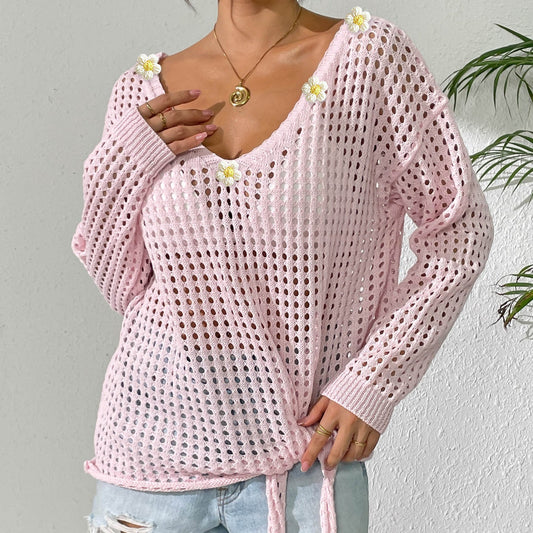 Women V neck Pullover Top Cutout Blouse Lace up Bow Outerwear Shirt Crochet Stitching Loose Sweater Women