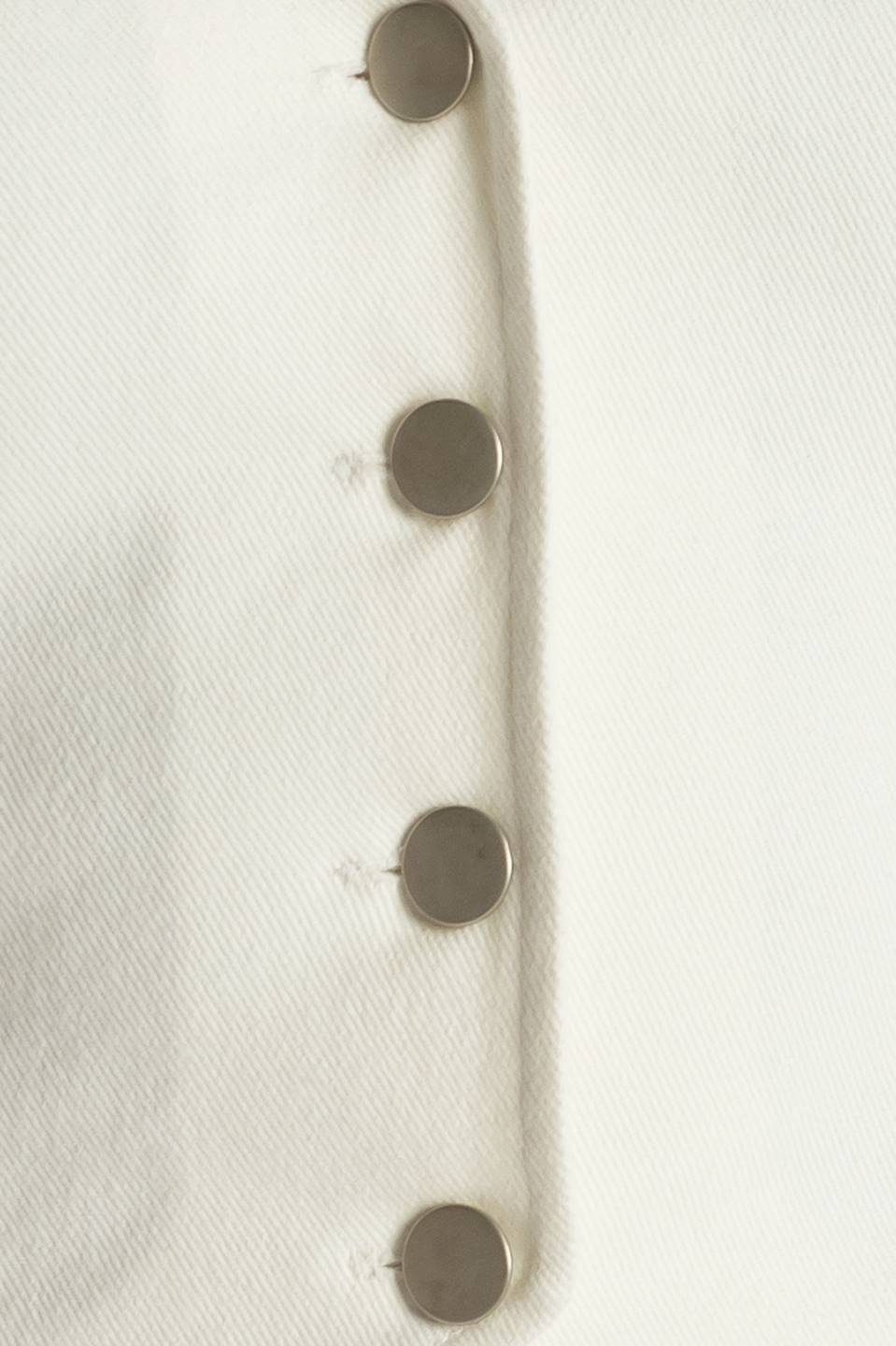 This washed denim vest features a front button closure and a cropped, tailored silhouette. Crafted from a cotton-spandex blend (97% cotton, 3% spandex), it offers comfortable stretch and shape retention. The sleeveless design makes it ideal for layering over tees, blouses, or lightweight knits, while a pointed hem provides a modern, polished finish.