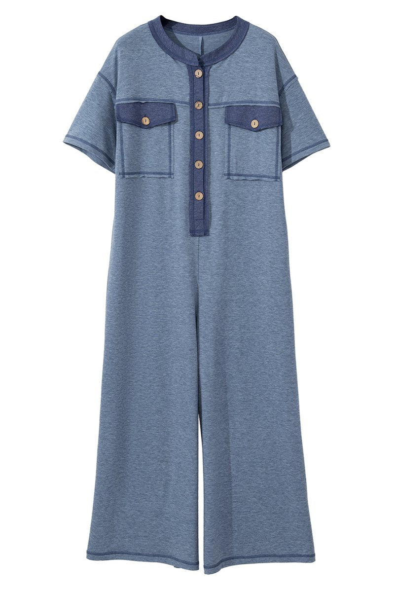 Beau Blue Half Placket Chest Pockets Short Sleeve Jumpsuit - Love Salve