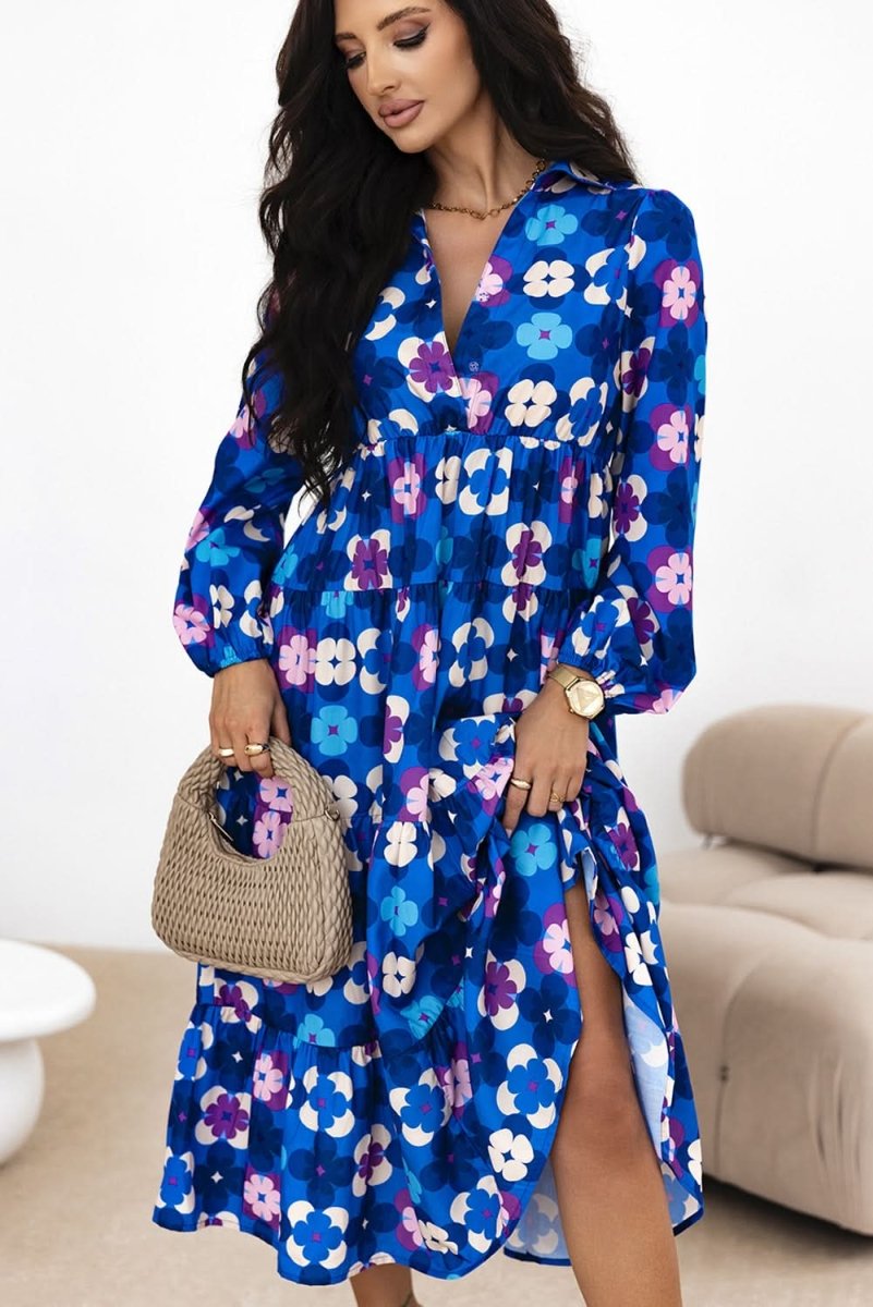 Blue Floral Peasant Sleeve Tiered Ruffle Midi Dress - Love Salve