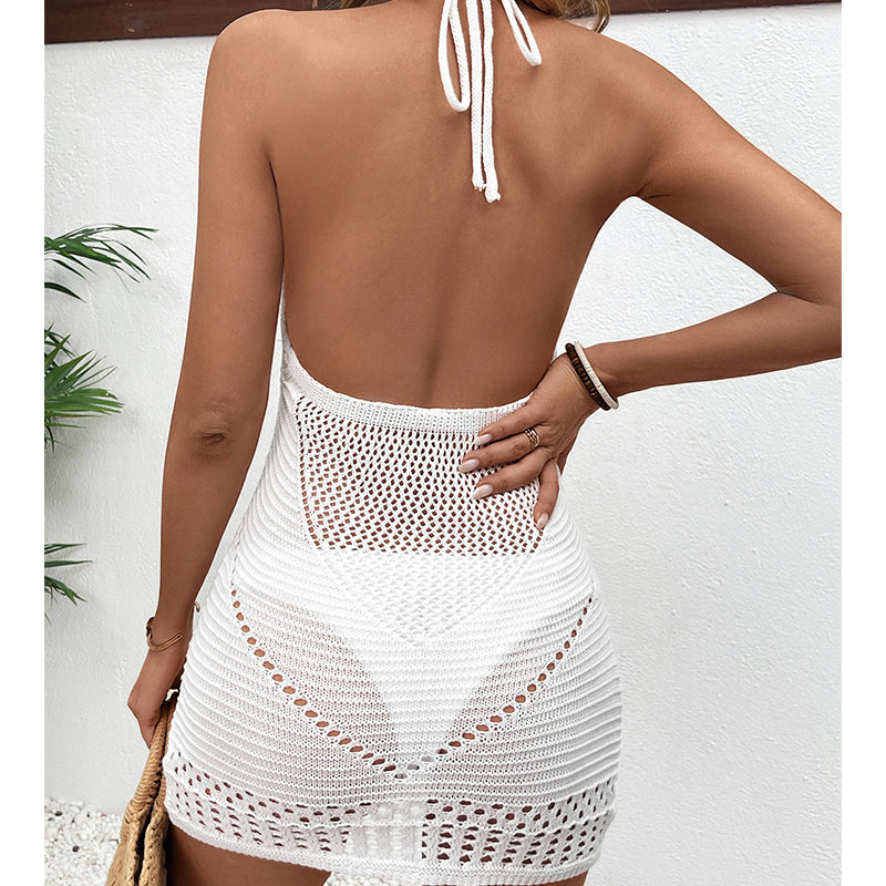Halter Lace Up Hollow Out Cutout Out Texture Sexy Big Backless Deep U Neck Beach Dress Crochet hook